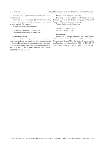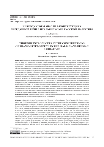 В данной статье на материале романа Дж. Бассани «II giardino dei Finzi-Contini» (нарратив от 1-го лица) и Л. Улицкой «Лестница Якова» (нарратив от 3-го лица) и их переводов, соответственно, на русский и итальянский языки рассматриваются интродукторы переданной речи, вводящие мысли персонажа. Сравнительно-сопоставительный анализ языка оригинала и перевода нацелен на выделение лексико-семантических и синтаксических особенностей, влияющих на восприятие итальянским и русским читателем конструкций переданной речи, выраженных в художественном тексте прямым, косвенным и несобственно-прямым способом. Определение степени воздействия интродукторов на читателя в разных режимах интерпретации эгоцентрических единиц в контексте традиционного нарратива и свободного косвенного дискурса, который характеризуется широким использованием несобственно-прямой речи, является не только ключом к выделению говорящего или мыслящего субъекта в полифонически организованном пространстве текста, но и указанием на некоторые типологические несоответствия, которые следует учитывать при изучении итальянского и русского языков и при переводе с них. Помимо ментальных глаголов и их позиции по отношению к вводимому высказыванию, будут проанализированы предикаты внутреннего временного состояния, перцептивные глаголы, возвратные речевые глаголы, акциональные глаголы, в которых действие совмещается с указанием на внутреннее состояние, - все они, комментируя слова персонажа, тем или иным образом имеют связь с ментальной семантикой и помогают читателю определить субъект переданной мысли в тексте.