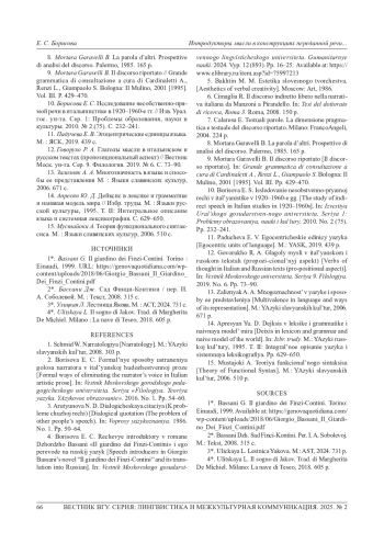 2. Борисова Е. С. Формальные способы устранения голоса нарратора в итальянской художественной прозе // Вестник Моск. город. пед. ун-та. Сер. “Филология. Теория языка. Языковое образование”. 2016. № 1. С. 54-60. EDN: VURRDB