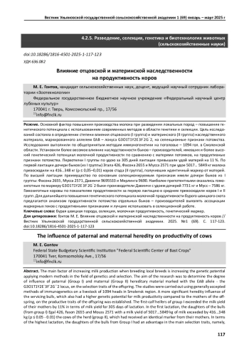 14. Гонтов М. Е., Кольцов Д. Н Молочная продуктивность коров бурой швицкой породы разных генотипов // Вестник российской сельскохозяйственной науки 2024. № 3. С85-91. DOI: 10.31857/S2500208224030195 EDN: YVTPXO