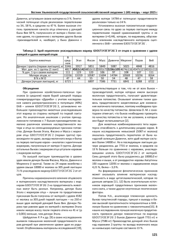 Основной фактор повышения производства молока при разведении локальных пород - повышение генетического потенциала с использованием современных методов в области генетики и селекции. Цель исследований состояла в определении степени влияния отцовского (I группа) и материнского (II группа) наследственного материала, маркированного аллелем EAB - локуса G3O1T1Y2E’3F’2G“2, на селекционные признаки потомства. Исследования выполнили по общепринятым методам иммуногенетики на поголовье - 1094 гол. в Смоленской области. Установили более весомое влияние наследственности быков - производителей, имевших и более высокий генетический потенциал молочной продуктивности по сравнению с матерями потомков, на продуктивные признаки потомства. Первотелки I группы по удою за 305 дней лактации превышали удой матерей на 11 %. По первой лактации дочери быков (из I группы) Эгала 426, Фасона 2655 и Мусса 2571 при удое 5017… 5849 кг молока превосходили на 416.348 кг (р < 0,05-0,01) коров стада (II группа), получивших идентичный маркер от матерей. По высшей лактации преимущество по основным селекционируемым признакам имели дочери быков из I группы: Фасона 2655, Мусса 2571, Давинчи 9695533 и Мерлинга 9690. Наиболее препотентными оказались гомозиготные по маркеру G3O1T1Y2E’3F’2G“2 быки-производители Давинчи с удоем дочерей 7731 кг и Мусс - 7586 кг. Гомозиготные коровы по показателям продуктивности за первую лактацию в среднем превосходили коров I и II групп. Для дальнейшего повышения генетического потенциала молочной продуктивности бурого швицкого скота предлагается анализом продуктивности потомства отдельных быков - производителей выявлять ассоциации маркерных генов с продуктивными признаками и лучшие использовать в селекционной работе.