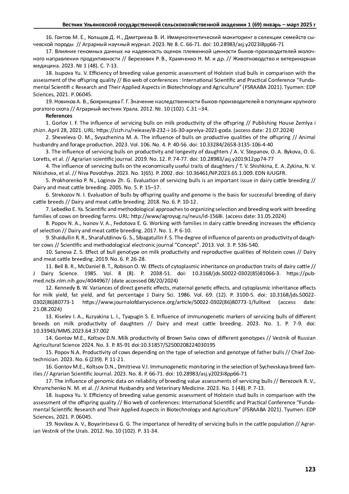 18. Isupova Yu. V. Efficiency of breeding value genomic assessment of Holstein stud bulls in comparison with the assessment of the offspring quality // Bio web of conferences: International Scientific and Practical Conference “Fundamental Scientifi c Research and Their Applied Aspects in Biotechnology and Agriculture” (FSRAABA 2021). Tyumen: EDP Sciences, 2021. P. 06045. EDN: UGEFDA