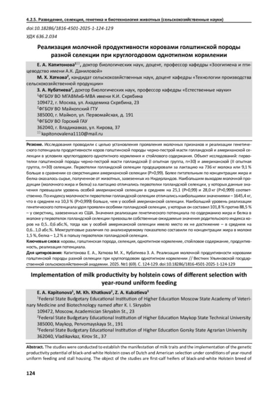 1. Улимбашев М.Б., Касаева М.Д. Хозяйственно-полезные признаки голштинизированного чёрно-пёстрого скота под влиянием паратипических факторов // Фундаментальные исследования. 2014. № 3-4. С. 763-765. EDN: RZMLJP