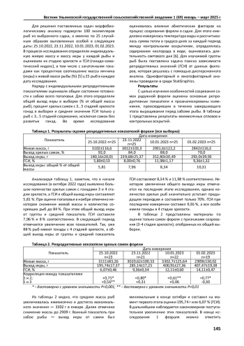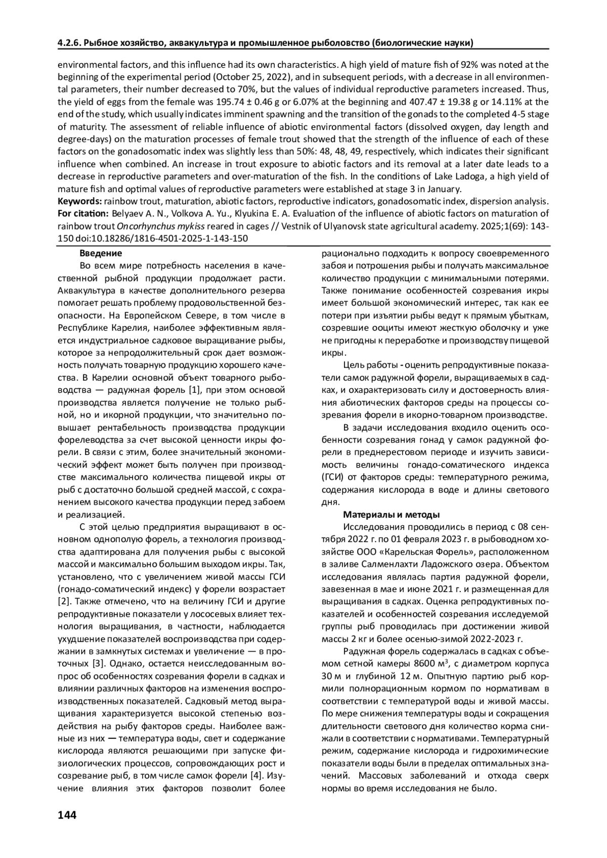 В представленной статье приведены результаты изучения репродуктивных показателей группы самок радужной форели (Oncorhynchus mykiss), состоящей из 100 особей, выращиваемых в садках в Ладожском озере. Целью исследований была оценка репродуктивных показателей самок радужной форели, выращиваемых в садках, и характеристика силы и достоверности влияния абиотических факторов среды на процессы созревания форели в икорно-товарном производстве. Для достижения поставленной цели применяли морфобиологический и дисперсионный анализы. Установили, что созревание рыб зависело от изменений факторов внешней среды, и это влияние имело свои особенности. В начале опытного периода (25 октября 2022 года) был отмечен высокий выход созревших рыб - 92%, а в последующие периоды при снижении всех параметров среды их количество сократилось до 70%, но при этом возросли значения индивидуальных репродуктивных показателей. Так, выход икры от самки составил 195,74±0,46 г или 6,07% в начале и 407,47±19,38 г или 14,11% в конце исследования, что обычно свидетельствует о близком нересте и переходе гонад к завершенной 4-5 стадии зрелости. Оценка достоверного влияния на процессы созревания самок форели абиотических факторов среды (растворенный кислород, длина светового дня и градусодни) показала, что сила влияния каждого из этих факторов на ГСИ составила чуть меньше 50%: 48, 48, 49 соответственно, что свидетельствует о значительном их влиянии при совместном воздействии. Таким образом, увеличение продолжительности выдерживания форели при совместном воздействии абиотических факторов и ее изъятие в более поздние сроки приводит к уменьшению репродуктивных показателей и перезреванию рыбы. В условиях Ладожского озера высокий выход зрелых рыб и оптимальные значения репродуктивных показателей установлены на этапе 3 в январе.