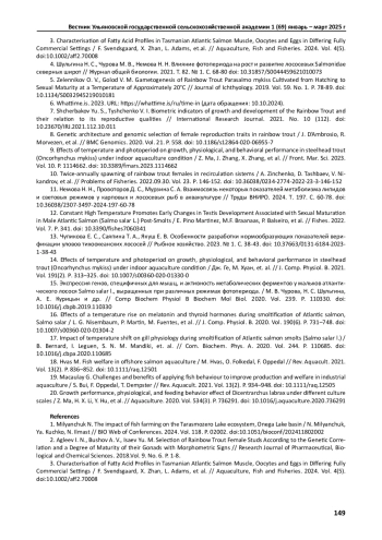 5. Zelennikov O. V., Golod V. M. Gametogenesis of Rainbow Trout Parasalmo mykiss Cultivated from Hatching to Sexual Maturity at a Temperature of Approximately 20°С // Journal of Ichthyology. 2019. Vol. 59. No. 1. P. 78-89. DOI: 10.1134/S0032945219010181 EDN: JCHCWB