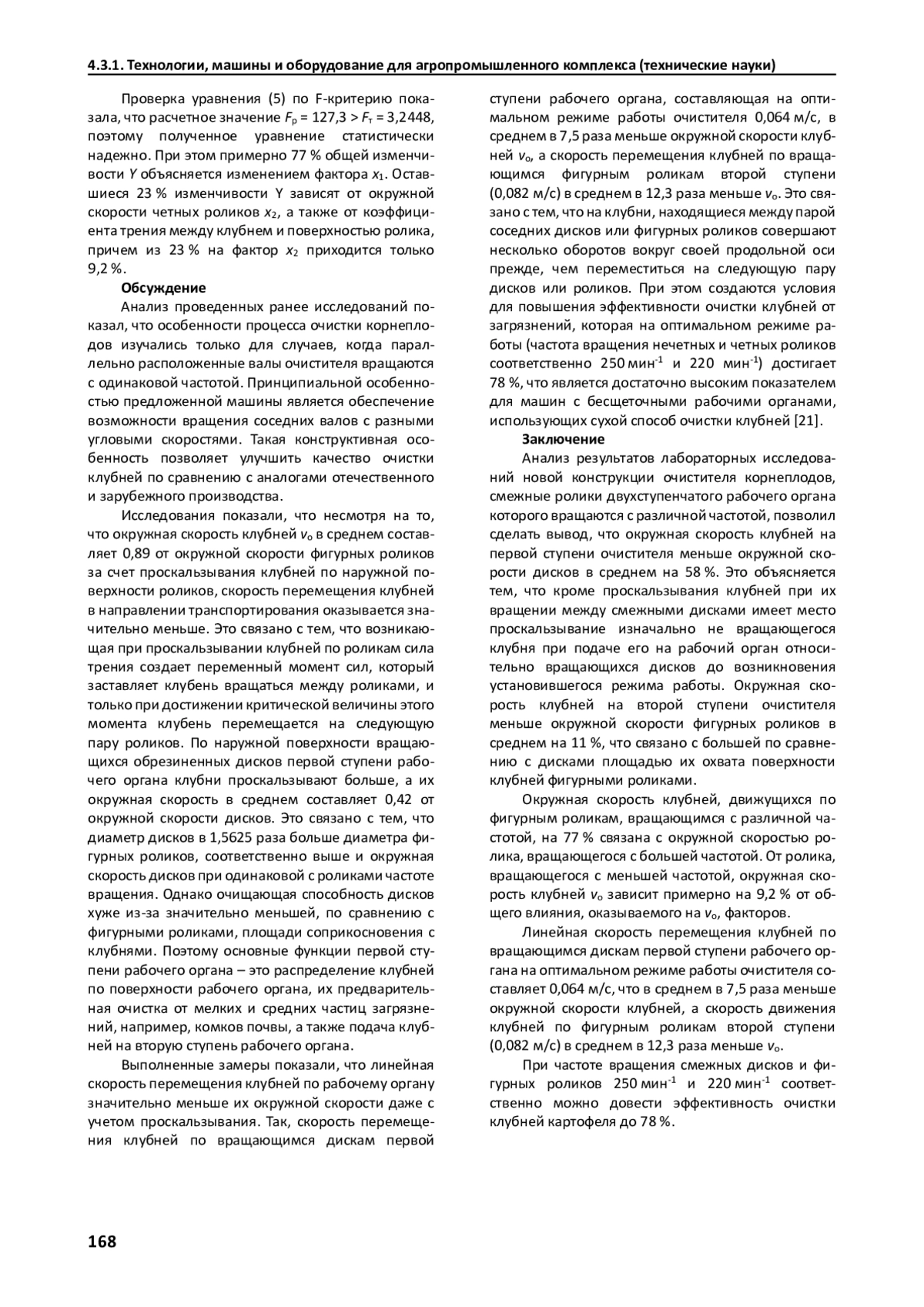 Задача качественной очистки корнеплодов от почвы актуальна как при уборке, так и при их подготовке к скармливанию животным. Наиболее востребованы в настоящее время машины для сухой очистки корнеплодов со щеточными рабочими органами. К недостаткам таких машин можно отнести повышенную травмируемость клубней при улучшении качества очистки. Цель исследований - изучение особенности кинематики клубней картофеля в инновационном очистителе корнеплодов для последующей оптимизации режимов его работы. Очистка клубней в машине происходит за счет вращения соседних роликов с разной частотой. При этом клубни за счет проскальзывания по поверхности роликов очищаются от налипшей на них почвы. В результате проведенных лабораторных исследований получена адекватная зависимость окружной скорости наружной поверхности клубня 0)0 от окружных скоростей нечетных и четных роликов. Выявлено, что примерно на 77 % зависит от окружной скорости ролика, вращающегося с большей частотой и только на 9,2 % - от окружной скорости соседнего ролика. Линейная скорость перемещения клубней по вращающимся дискам первой ступени рабочего органа на оптимальном режиме работы очистителя составляет 0,064 м/с, что в среднем в 7,5 раза меньше окружной скорости клубней, а скорость движения клубней по фигурным роликам второй ступени, которая равна 0,082 м/c, в среднем в 12,3 раза меньше окружной скорости клубней. Определено, что при частоте вращения смежных фигурных роликов 250 мин-1 и 220 мин-1 можно довести эффективность очистки клубней картофеля до 78 %.