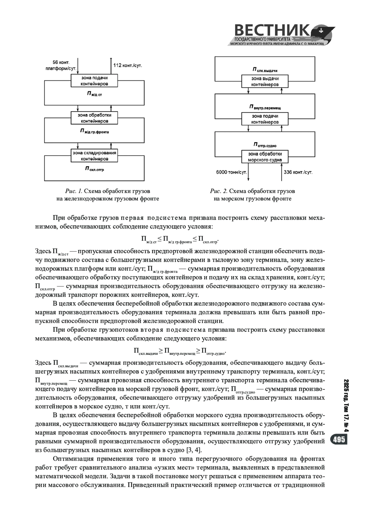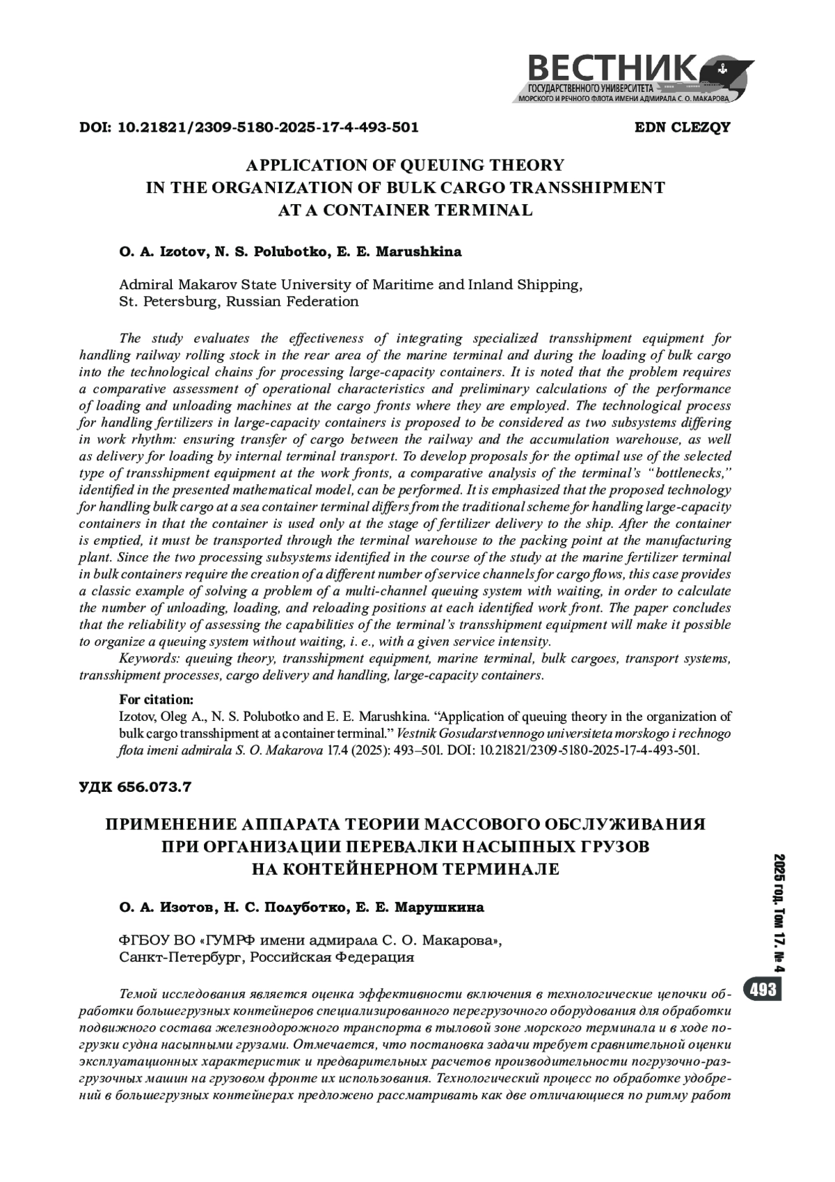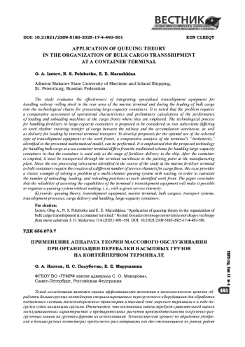 Темой исследования является оценка эффективности включения в технологические цепочки обработки большегрузных контейнеров специализированного перегрузочного оборудования для обработки подвижного состава железнодорожного транспорта в тыловой зоне морского терминала и в ходе погрузки судна насыпными грузами. Отмечается, что постановка задачи требует сравнительной оценки эксплуатационных характеристик и предварительных расчетов производительности погрузочно-разгрузочных машин на грузовом фронте их использования. Технологический процесс по обработке удобрений в большегрузных контейнерах предложено рассматривать как две отличающиеся по ритму работ подсистемы, обеспечивающие передачу груза между железной дорогой и складом накопления и подачу груза на погрузку внутритерминальным транспортом. В целях выработки предложений по поиску оптимального применения на фронтах работ выбранного типа перегрузочного оборудования может быть произведен сравнительный анализа «узких мест» терминала, обозначенных в представленной математической модели. Подчеркивается, что приведенная технология обработки насыпных грузов на морском контейнерном терминале отличается от традиционной схемы обработки большегрузных контейнеров тем, что контейнер применяется на этапе доставки удобрений только до борта судна — после высыпания груза он подлежит транспортировке через склад терминала до пункта затарки на завод-производитель. Поскольку выделенные в ходе исследования две подсистемы обработки на морском терминале удобрений в насыпных контейнерах требуют создания разного количества каналов обслуживания грузопотоков, в данном случае имеет место классический пример решения задачи многоканальной системы массового обслуживания с ожиданием с целью расчета количества мест выгрузки, погрузки и перегрузки на каждом выявленном фронте работ. В работе сделан вывод о том, что достоверность оценки возможностей перегрузочного оборудования терминала позволит организовать систему массового обслуживания без ожидания обслуживания в очереди, т. е. с заданной интенсивностью.