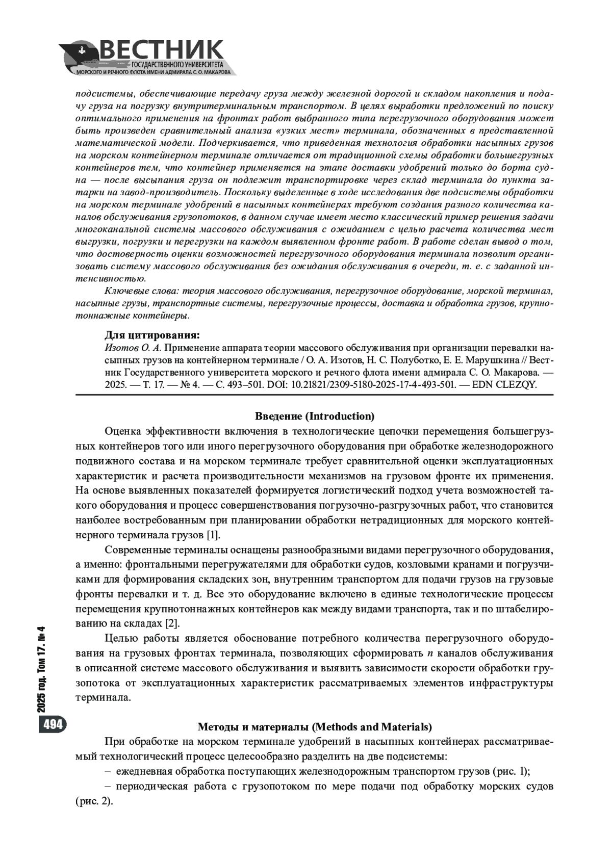 1. Изотов О. А. Обоснование возможности обработки контейнеризированных навалочных грузов на морском терминале / О. А. Изотов, Н. С. Полуботко // Вестник государственного университета морского и речного флота имени адмирала С. О. Макарова. - 2025. - Т. 17. - № 2. - С. 208-215. https://doi.org/10.21821/23095180-2025-17-2-208-215. - EDN HRYNBC.