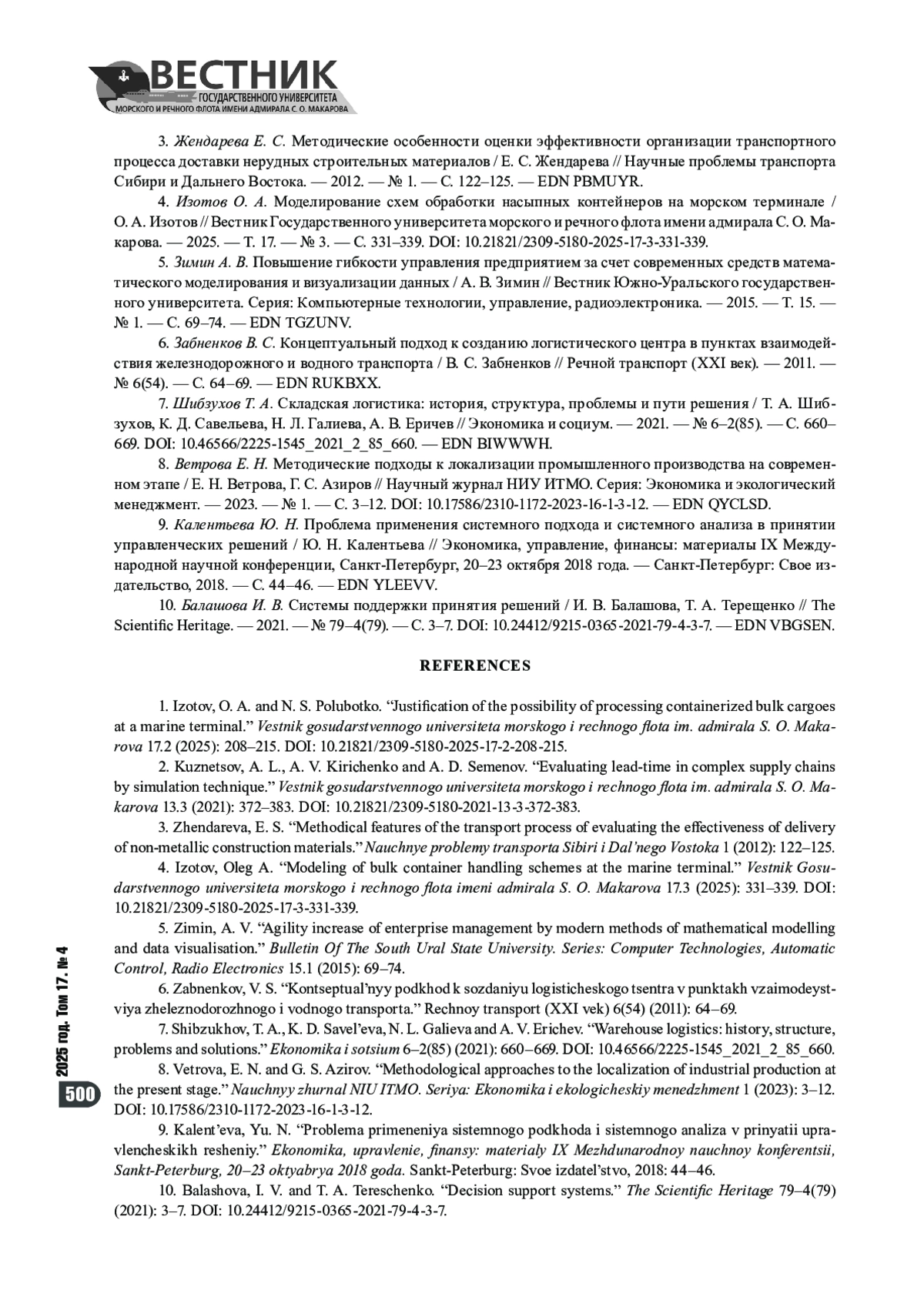 4. Изотов О. А. Моделирование схем обработки насыпных контейнеров на морском терминале / О. А. Изотов // Вестник Государственного университета морского и речного флота имени адмирала С. О. Макарова. - 2025. - Т. 17. - № 3. - С. 331-339. https://doi.org/10.21821/2309-5180-2025-17-3-331-339.