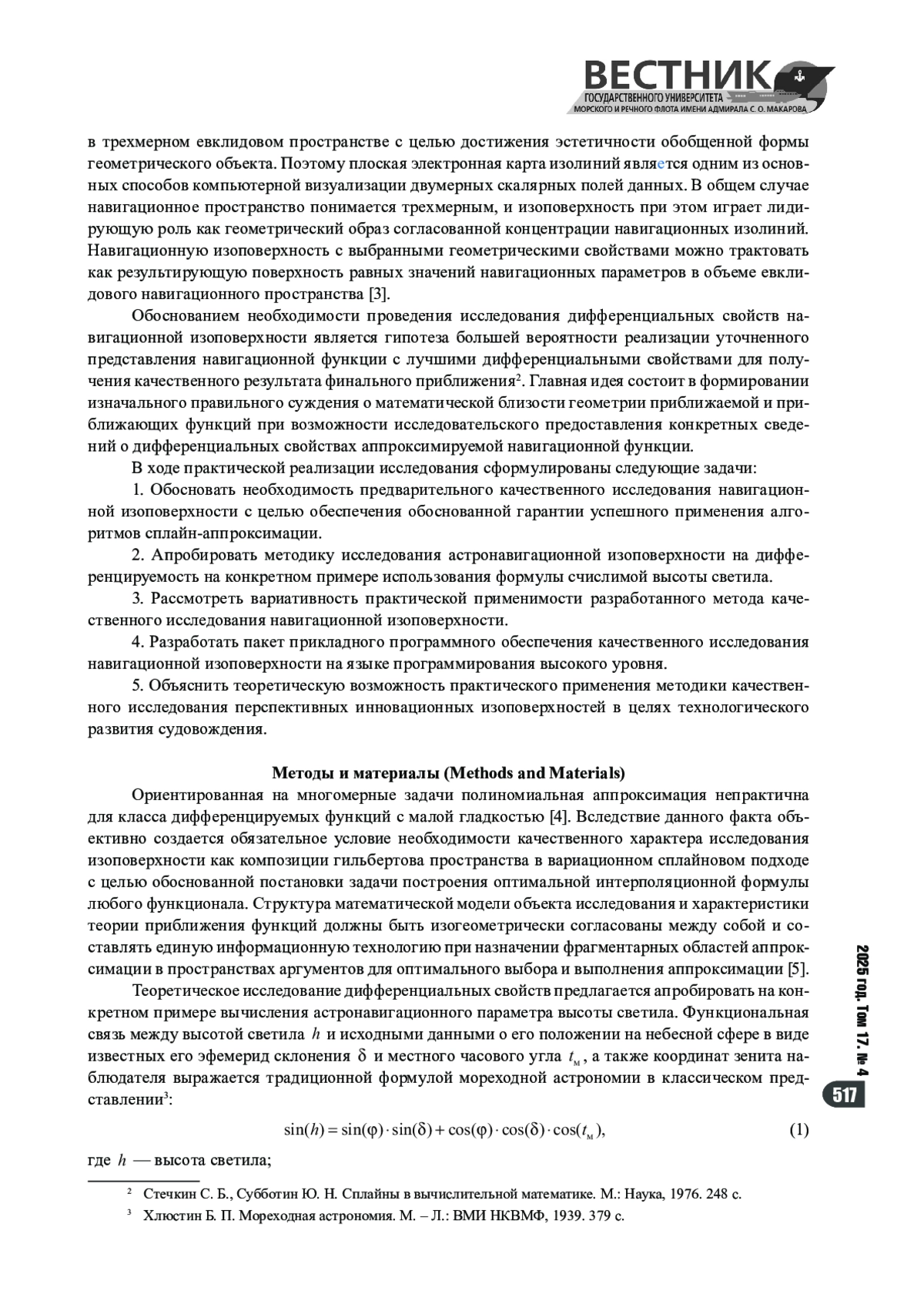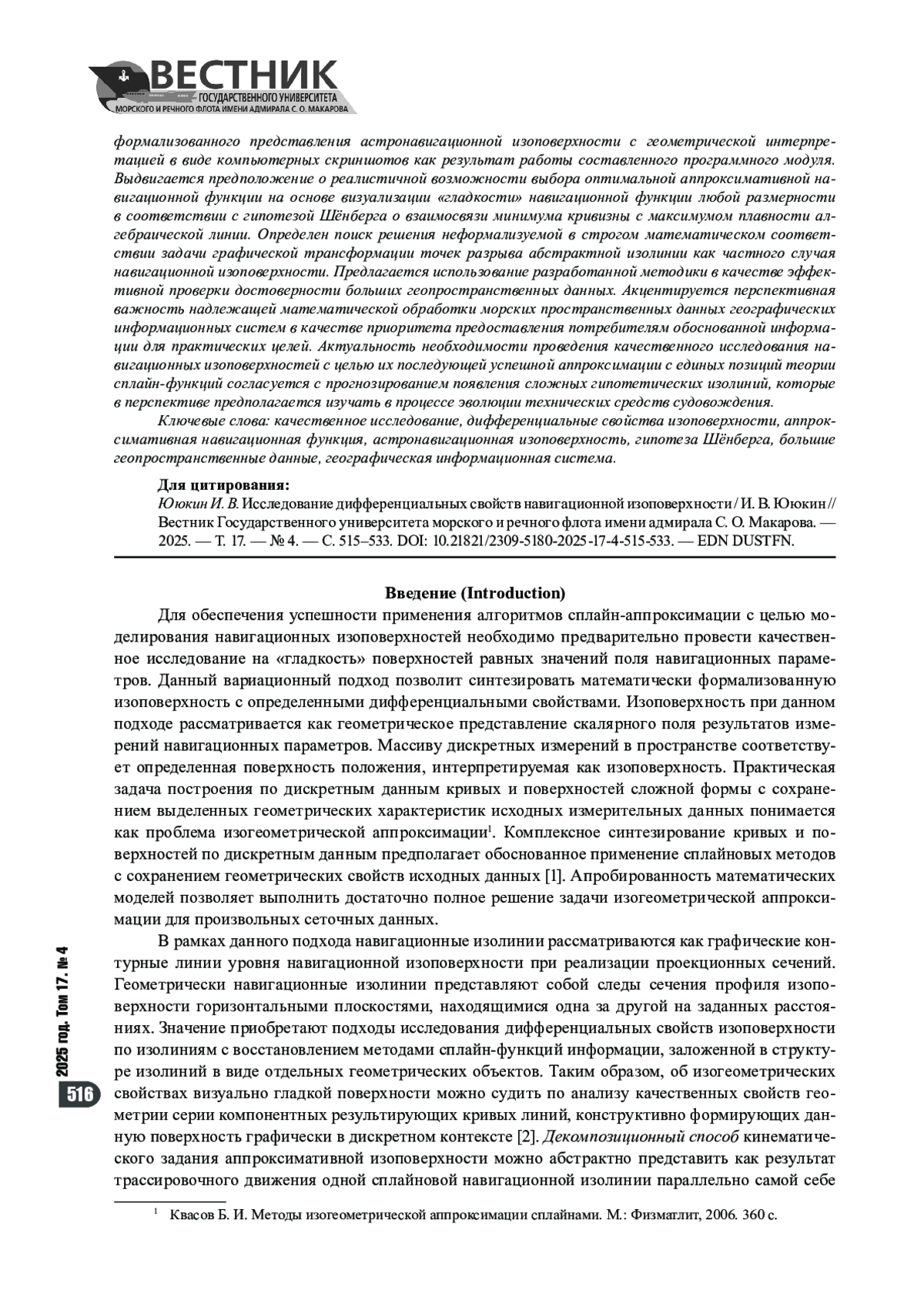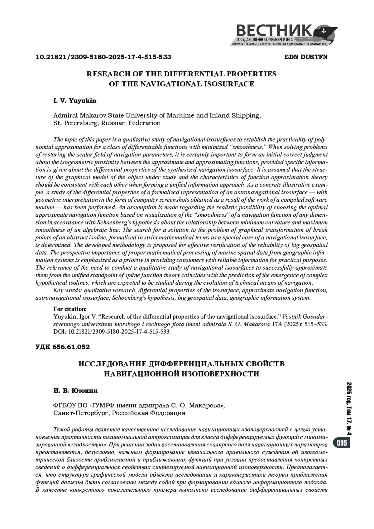 ЮЮКИН И. В. ИССЛЕДОВАНИЕ ДИФФЕРЕНЦИАЛЬНЫХ СВОЙСТВ НАВИГАЦИОННОЙ ИЗОПОВЕРХНОСТИ // ВЕСТНИК ГОСУДАРСТВЕННОГО УНИВЕРСИТЕТА МОРСКОГО И РЕЧНОГО ФЛОТА ИМ. АДМИРАЛА С. О. МАКАРОВА. 2025. Т. 17 №4