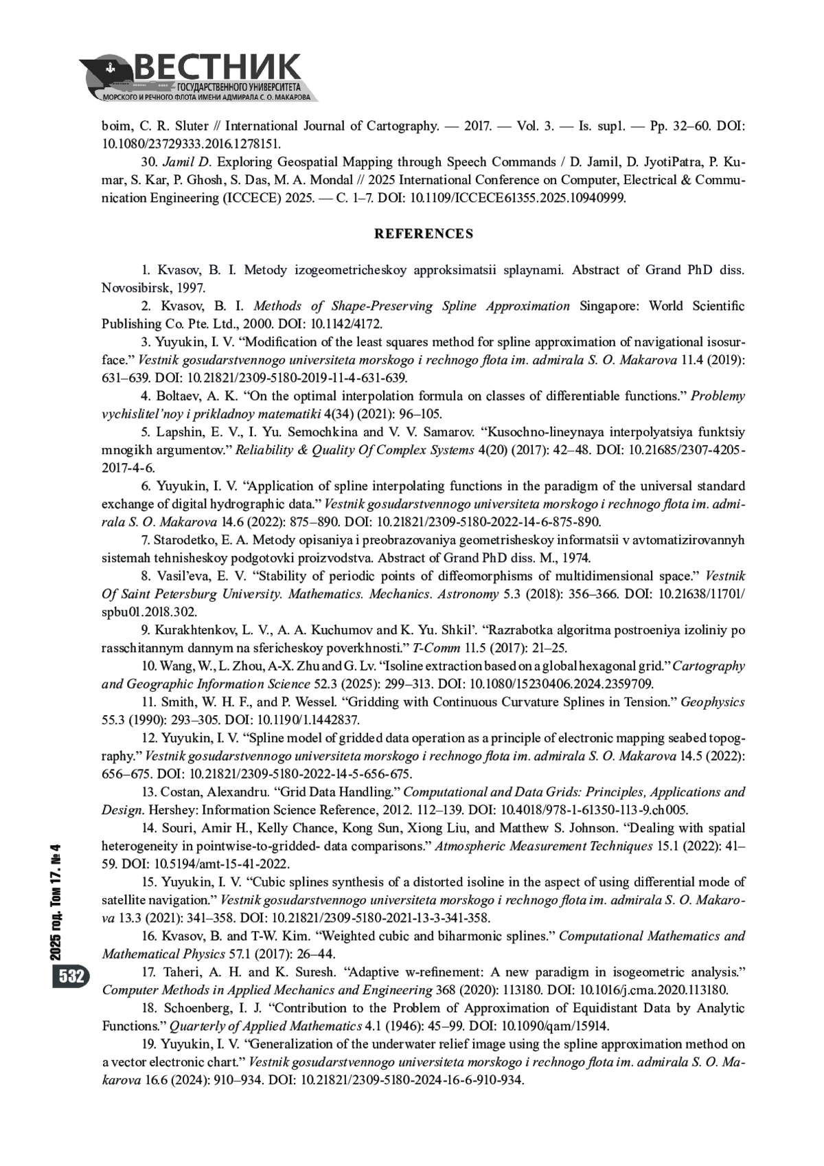 Темой работы является качественное исследование навигационных изоповерхностей с целью установления практичности полиномиальной аппроксимация для класса дифференцируемых функций с минимизированной «гладкостью». При решении задач восстановления скалярного поля навигационных параметров представляется, безусловно, важным формирование изначального правильного суждения об изогеометрической близости приближаемой и приближающих функций при условии предоставления конкретных сведений о дифференциальных свойствах синтезируемой навигационной изоповерхности. Предполагается, что структура графической модели объекта исследования и характеристики теории приближения функций должны быть согласованы между собой при формировании единого информационного подхода. В качестве конкретного показательного примера выполнено исследование дифференциальных свойств формализованного представления астронавигационной изоповерхности с геометрической интерпретацией в виде компьютерных скриншотов как результат работы составленного программного модуля. Выдвигается предположение о реалистичной возможности выбора оптимальной аппроксимативной навигационной функции на основе визуализации «гладкости» навигационной функции любой размерности в соответствии с гипотезой Шёнберга о взаимосвязи минимума кривизны с максимумом плавности алгебраической линии. Определен поиск решения неформализуемой в строгом математическом соответствии задачи графической трансформации точек разрыва абстрактной изолинии как частного случая навигационной изоповерхности. Предлагается использование разработанной методики в качестве эффективной проверки достоверности больших геопространственных данных. Акцентируется перспективная важность надлежащей математической обработки морских пространственных данных географических информационных систем в качестве приоритета предоставления потребителям обоснованной информации для практических целей. Актуальность необходимости проведения качественного исследования навигационных изоповерхностей с целью их последующей успешной аппроксимации с единых позиций теории сплайн-функций согласуется с прогнозированием появления сложных гипотетических изолиний, которые в перспективе предполагается изучать в процессе эволюции технических средств судовождения.
