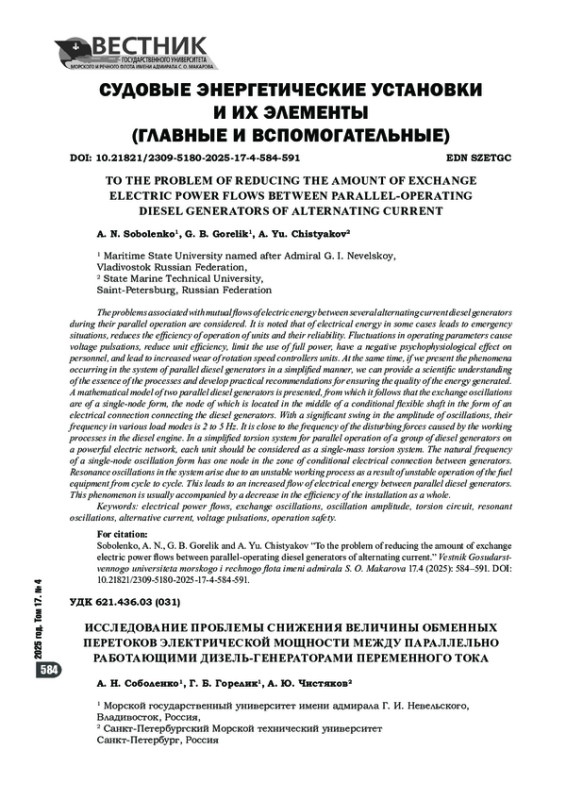 Рассмотрены проблемы, связанные с взаимными перетеканиями электрической энергии между несколькими дизель-генераторов переменного тока при их параллельной работе. Отмечается, что амплитуда электроэнергии в ряде случаев приводит к аварийным ситуациям, снижает эффективность эксплуатации агрегатов и их надежность. Колебания режимных параметров вызывают пульсацию напряжения, снижают коэффициент полезного действия агрегатов, ограничивают использование полной мощности, оказывают отрицательное психофизиологическое воздействие на персонал, приводят к повышенному износу агрегатов. Понимание сути происходящих процессов и физической природы обменных колебаний позволяют принимать соответствующие технические решения, выполнять опытно-конструкторские разработки и обеспечивать безопасность эксплуатации дизель-электрических агрегатов при их параллельной работе. Из представленной математической модели двух параллельно работающих дизель-генераторов следует, что обменные колебания, узел которых находится посредине условного податливого вала в виде электрической связи, соединяющей ДГ, имеют одноузловую форму. Обращается внимание на то, что при значительном размахе амплитуды колебаний их частота на различных режимах нагрузки близка к частоте возмущающих сил, вызванных рабочими процессами в дизеле. Отмечается, что в упрощенной крутильной системе для параллельной работы группы ДГ на мощную электрическую сеть следует рассматривать каждый агрегат в качестве одномассовой крутильной системы. Сделан вывод о том, что собственная частота одноузловой формы колебаний имеет один узел в зоне условной электрической связи между генераторами. Рассмотрены резонансные колебания в системе, возникающие из-за неустойчивости рабочего процесса вследствие нестабильной работы топливной аппаратуры от цикла к циклу, которые приводят к повышенному перетеканию электрической энергии между параллельно работающими дизель-генераторами. Это явление сопровождается, как правило, снижением эффективности установки в целом.