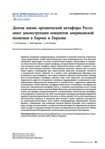 Идейное измерение международных отношений и внешней политики отдельных стран представляет собой самостоятельное поле взаимодействия. Его изучение неизбежно происходит на стыке политической теории и философии. В социально-политической области яркая метафора, которая является базовым инструментом познания, может овладеть умами околополитических слоёв и надолго стать для них «когнитивным ключом», объясняющим политику. Однако она не только может давать необходимое для практических действий понимание контекста и внутренней логики событий, но и может стать своеобразным фильтром при восприятии происходящего, тем самым неявным образом ограничивая свободу воли воспринявшего метафору субъекта. При этом идеализм, постулирующий первичность идей по отношению к материи, подразумевает и возможность преобразования материальной реальности в соответствии с заданными идейными основаниями. Таким образом, метафора может быть сильнейшим инструментом политики. Органическая метафора Руссо, а особенно выстроенные на её основе концептуальные основы политики Вудро Вильсона, рассматриваются в настоящей статье как пример инструментального использования политической метафоры. В исследовании показано, как США использовали метафору для форматирования идейного уровня европейской политики, а сейчас делают это на континентальных пространствах Евразии. В прошлом веке концепт наций позволял расщеплять на неконкурентоспособные части любое конкурирующее образование. Однако борьба с империями, под знаменем которой прошла большая часть прошлого века, отнюдь не закончилась с их фактическим распадом. В современных условиях США, исходя из принципа divide et impera, последовательно противостоят любым интеграционным объединениям, возникающим на пространствах Евразии.
