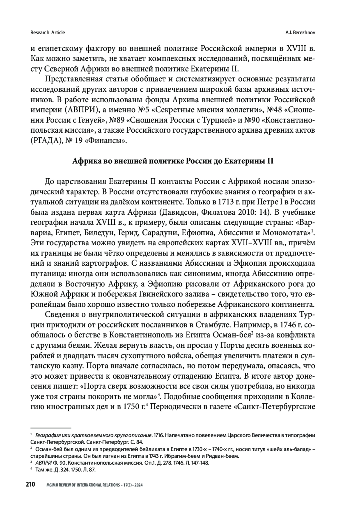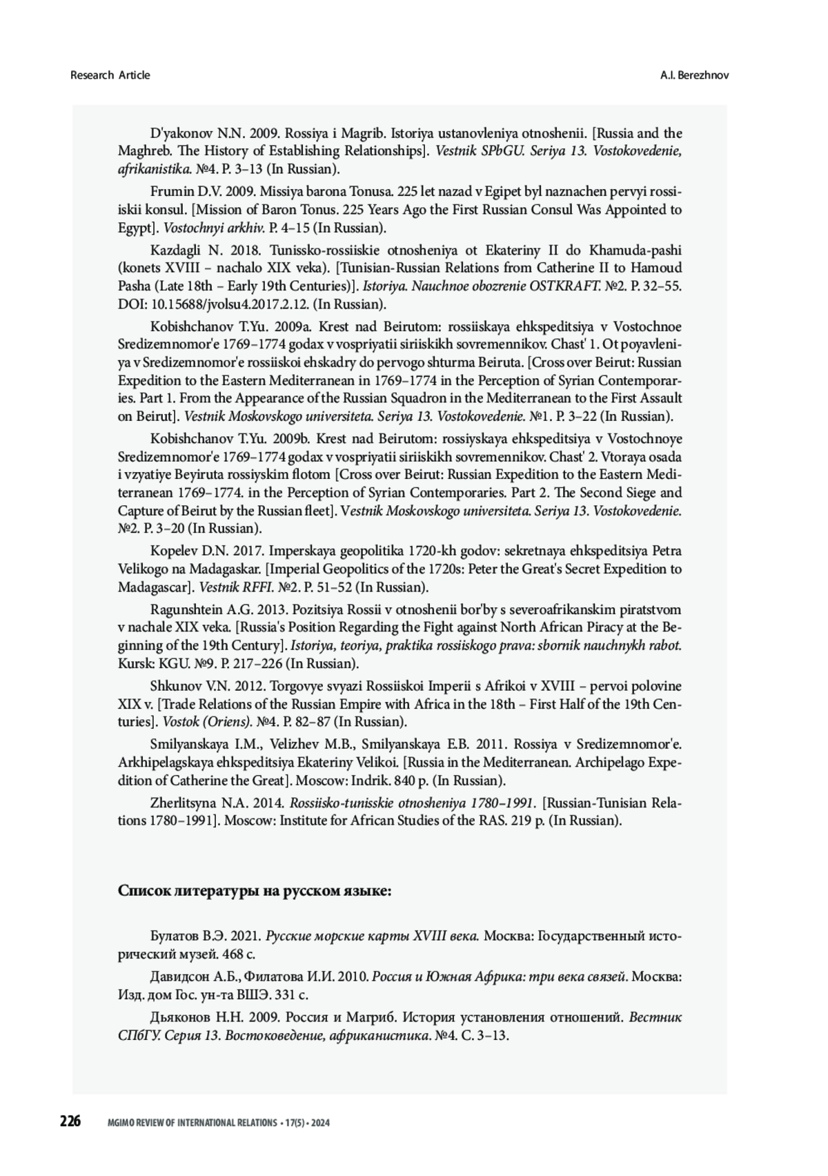 XVIII в. во многих отношениях определил судьбу Российской империи. В стране созревали внутренние предпосылки для модернизации, были достигнуты серьёзные внешнеполитические успехи. Пётр I «прорубил окно» в Европу, а Екатерина II решила задачу открытия для России Чёрного моря. Последнее не только позволило перенести центр земледелия России в южные плодородные земли, но и открыло путь к новым международным морским путям. Геополитические возможности страны заметно расширились. Оказалась «приоткрытой» даже дверь в Африку. До получения выхода в Чёрное и Средиземное моря контактов у России со странами Северной Африки практически не существовало. Именно в екатерининскую эпоху возникла возможность российского взаимодействия с Египтом, Алжиром, Марокко, Тунисом и Триполи. В данной статье исследуются внешнеполитические инициативы России в Северной Африке в царствование Екатерины II. Российская деятельность на этом континенте дополняла усилия на главном для внешней политики Российской империи во второй половине XVIII в. горизонте противоборства с Турцией. Используя сепаратистские движения на окраинах Османской империи, Россия добивалась ослабления и отвлечения сил своего противника во время русско-турецких войн. В мирное время Россия стремилась обеспечить безопасность своих торговых судов. Во второй половине XVIII – начале XIX вв. российская торговля в Средиземном море страдала от нападения корсаров варварийских государств, а именно Туниса, Алжира и Триполи. Для разрешения этой проблемы Россия оказывала давление на Порту, а также пыталась заключить мирные договоры с государствами Северной Африки. Первые шаги России на Африканском континенте были очень скромными, не лишёнными авантюризма, и далеко не все планы удалось реализовать. Статья написана на базе документов из Архива внешней политики Российской империи (АВПРИ) и Российского государственного архива древних актов (РГАДА), которые позволяют понять, как принимались решения и велись переговоры со странами Северной Африки. Некоторые аспекты первых российско-африканских контактов рассматривались в российской и зарубежной исторической литературе, но большее внимание уделялось отдельным сюжетам и странам. В данной статье предпринята попытка всестороннего обозрения причин и содержания внешней политики России XVIII столетия в отношении Северной Африки.