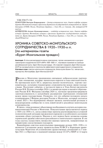 В статье рассматривается военно-политическое, торгово-экономическое и культурно-гуманитарное сотрудничество СССР и МНР в 1920-1930-х гг., получившее отражение на страницах республиканской газеты «Бурят-Монгольская правда». Это позволяет определить Бурят-Монгольскую АССР как значимый регион в строительстве эффективного межгосударственного сотрудничества.