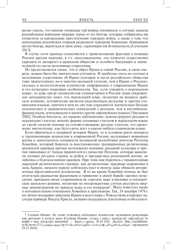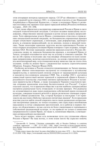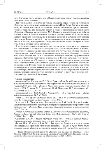 Образ России в современном Иране складывается из целого ряда компонентов. Очень большую роль в нем играет негативная историческая память из-за двух русско-персидских войн, помощи России в подавлении Конституционной революции, поддержки Ирака со стороны СССР в войне с Ираном. Отношение к России также сильно зависит от возраста, региона проживания, религиозных убеждений иранцев. Более консервативные и живущие в провинции иранцы склонны заметно лучше относиться к России, чем прозападная молодежь мегаполисов. Особенно негативное отношение к России - у иранцев, живущих на Западе, а также у воинствующих атеистов и радикальных персидских националистов, презирающих ирано-исламскую культуру. Улучшить образ России в иранском обществе можно с помощью популяризации исторических событий, когда Россия или СССР оказывали помощь мусульманским народам.