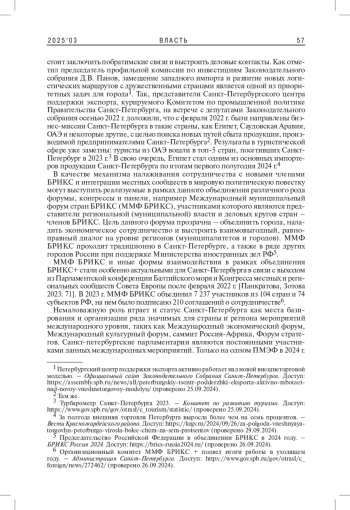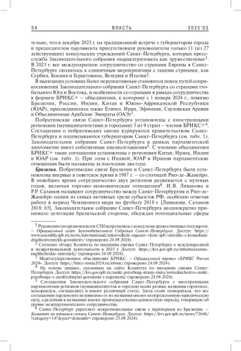 В данной статье автор анализирует состояние и перспективы развития международных связей Санкт-Петербурга в новых геополитических условиях. Автор делает акцент на анализе международной деятельности парламента Санкт-Петербурга со странами - членами БРИКС+. В статье дается сравнительный анализ соглашений правительства и парламента Санкт-Петербурга с регионами стран - членов объединения, включая обзор основных достижений, направлений деятельности и потенциал дальнейшего развития.
