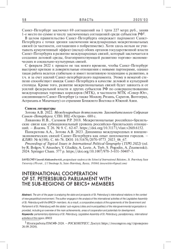 1. Зотова А.В. 2022. Международная деятельность Законодательного Собрания Санкт-Петербург. СПб: ИЦ “Остров”. 680 с. EDN: GIMPRJ