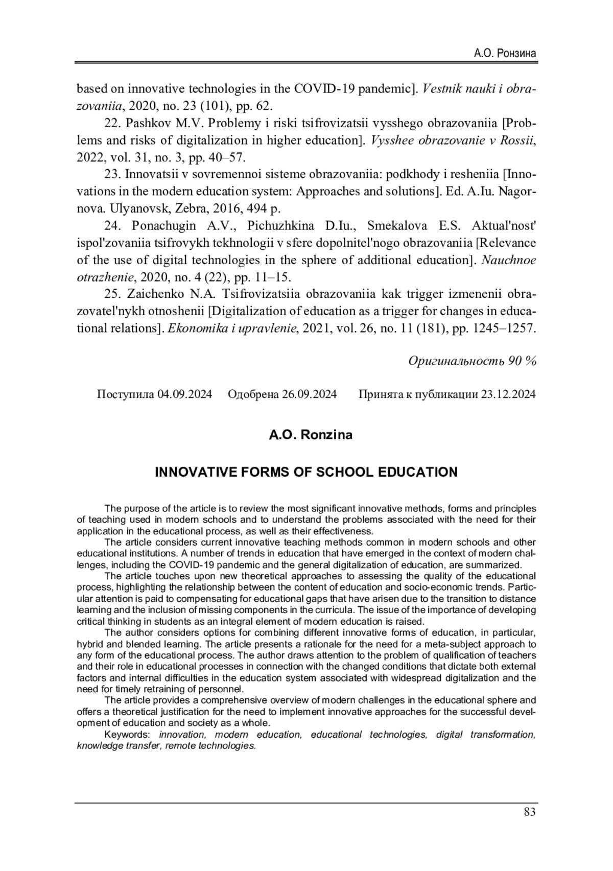 Представлен обзор наиболее значимых инновационных методов, форм и принципов обучения, применяемых в современных школах, и осмысление проблем, связанных с необходимостью их применения, внедрением в образовательный процесс, а также их эффективностью. Рассмотрены актуальные инновационные методы обучения, распространенные в современной школе и других образовательных и воспитательных учреждениях. Обобщен ряд тенденций в образовании, возникших в условиях современных вызовов, включая пандемию COVID-19 и всеобщую цифровизацию образования. Представлены новые теоретические подходы к оценке качества образовательного процесса, показана связь содержания образования с социально-экономическими тенденциями. Особое внимание уделено компенсации образовательных пробелов, возникших из-за перехода на дистанционное обучение, и включению недостающих компонентов в учебные программы. Рассмотрен вопрос о значении формирования у учащихся критического мышления как неотъемлемого элемента современного образования. Приведены варианты совмещения разных инновационных форм обучения, в частности, гибридное и смешанное обучение. Представлено обоснование необходимости метапредметного подхода к любым формам образовательного процесса. Обращено внимание на проблему квалификации педагогов и их роли в образовательных процессах в связи с изменившимися условиями, которые диктуют как внешние факторы, так и внутренние сложности в системе образования, связанные с повсеместной цифровизацией и необходимостью своевременной переподготовки кадров. Проведен всесторонний обзор современных вызовов в образовательной сфере и теоретически обоснована необходимость внедрения инновационных подходов для успешного развития образования и общества в целом.