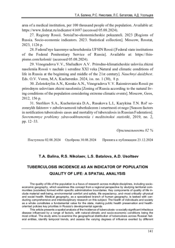 Статья: ЗАБОЛЕВАЕМОСТЬ ТУБЕРКУЛЕЗОМ КАК ИНДИКАТОР КАЧЕСТВА ЖИЗНИ НАСЕЛЕНИЯ: ПРОСТРАНСТВЕННЫЙ АНАЛИЗ (2025)