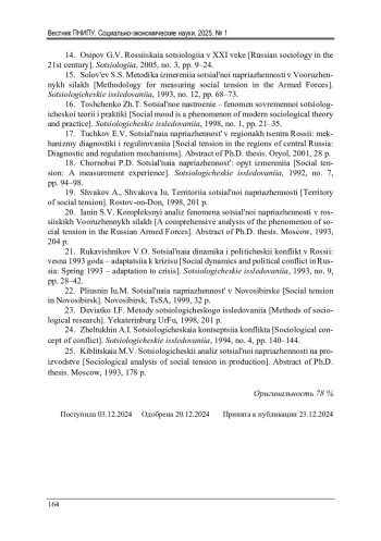 15. Соловьев, С.С. Методика измерения социальной напряженности в Вооруженных силах / С.С. Соловьев // Социологические исследования. - 1993. - № 12. - С. 68-73. EDN: XYMTSP