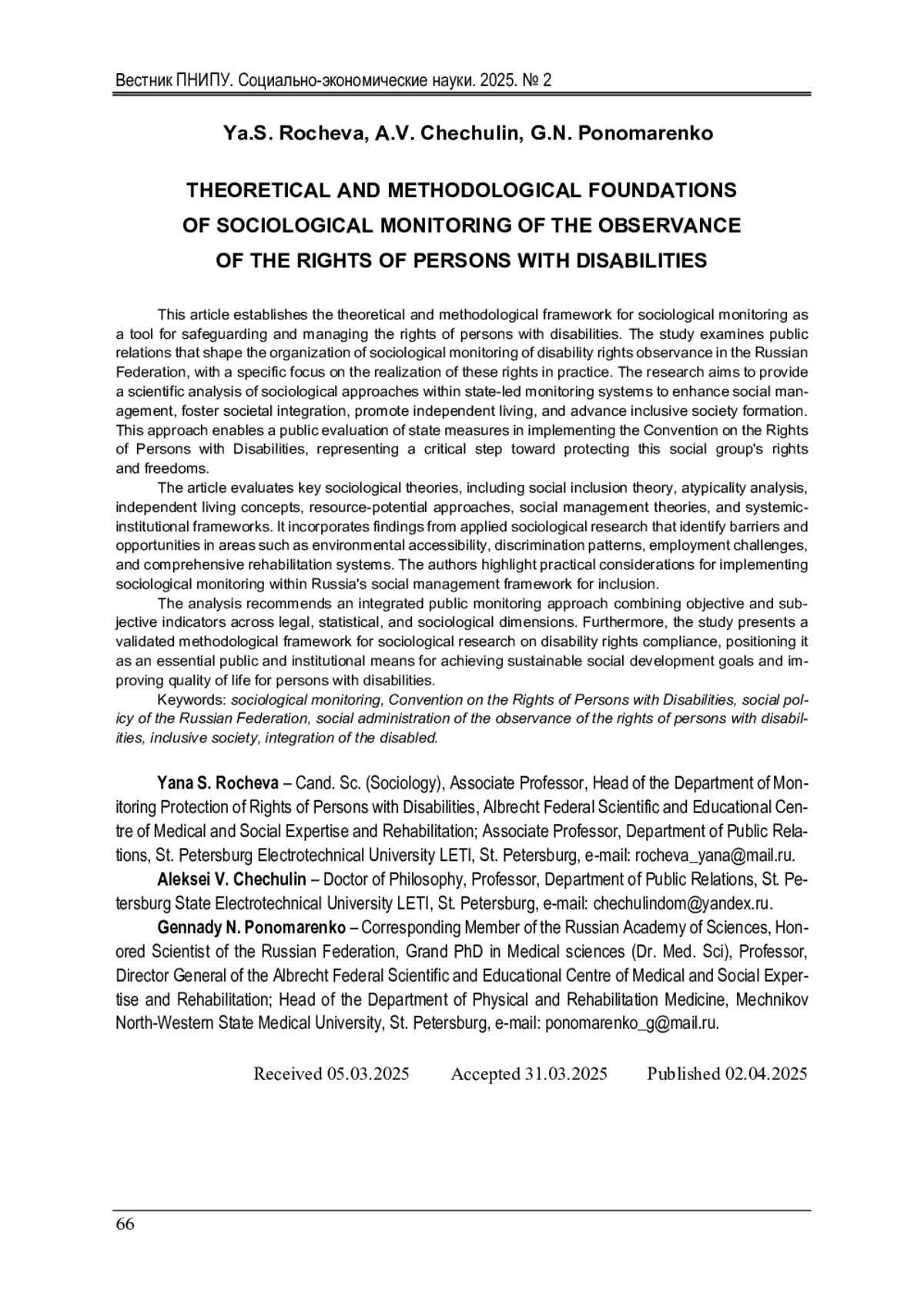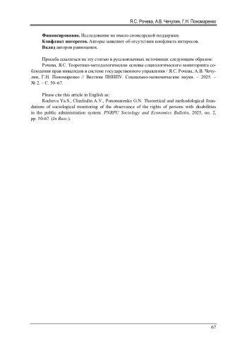 8. Рочева, Я.С. Проблемы изучения социальной инклюзии инвалидов в современном обществе / Я.С. Рочева, А.Л. Шавонин // Социология. - 2024. - № 10. - С. 124-227. DOI: 10.24412/1812-9226-2024-10-124-127