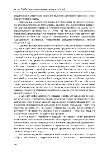 Проведен анализ и дана оценка характера современной макроэкономической нестабильности в контексте необходимости достижения динамического равновесия в сфере трудовой занятости населения. Обосновывается тезис о необходимости перехода от концепции устойчивого развития, которая в условиях растущей социально-экономической и общественно-политической нестабильности и турбулентности все меньше соответствует вызовам времени, к идее быстро реагирующей на изменения системе гибкого управления социально-экономическими процессами, отражающей особенности современной «антропосферы». Задачами исследования являются оценка представлений современной науки о сущности понятий экономической стабильности, экономического равновесия, компаративный анализ существующих научных подходов к оценке экономического равновесия (идей Ж. Дебре, А. Маршалла, Т. Модиса, Р. Курцвейла, Р. Сури, К. Эрроу и др.), а также вопросов его достижения на рынке труда (рабочей силы) и на самом предприятии. В статье отражены результаты многолетней дискуссии в вопросах формирования и обсуждения новых концепций и теоретико-методологических подходов к анализу и оценке трудовой занятости в условиях долгосрочного и системного кризиса. Поскольку в условиях информационного общества и цифровой революции происходит качественное изменение характера трудовых ресурсов предприятия, в статье предложено использование многовариантных, вариативных, полиморфных технологий в принятии управленческих (кадровых) решений, а также устранение оппортунистического поведения работников посредством развития трудового самоуправления, на принципах гарантированной занятости (пожизненного найма), формирования так называемых «рабочих групп» (креативное самоуправление) и более последовательного учета возрастных и профессиональных качеств самих работников при оплате их труда.