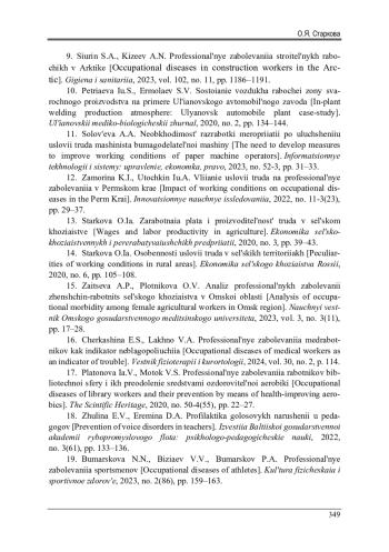 9. Сюрин, С.А. Профессиональные заболевания строительных рабочих в Арктике / С.А. Сюрин, А.Н. Кизеев // Гигиена и санитария. - 2023. - Т. 102, № 11. - С. 1186-1191. EDN: UQAQCV