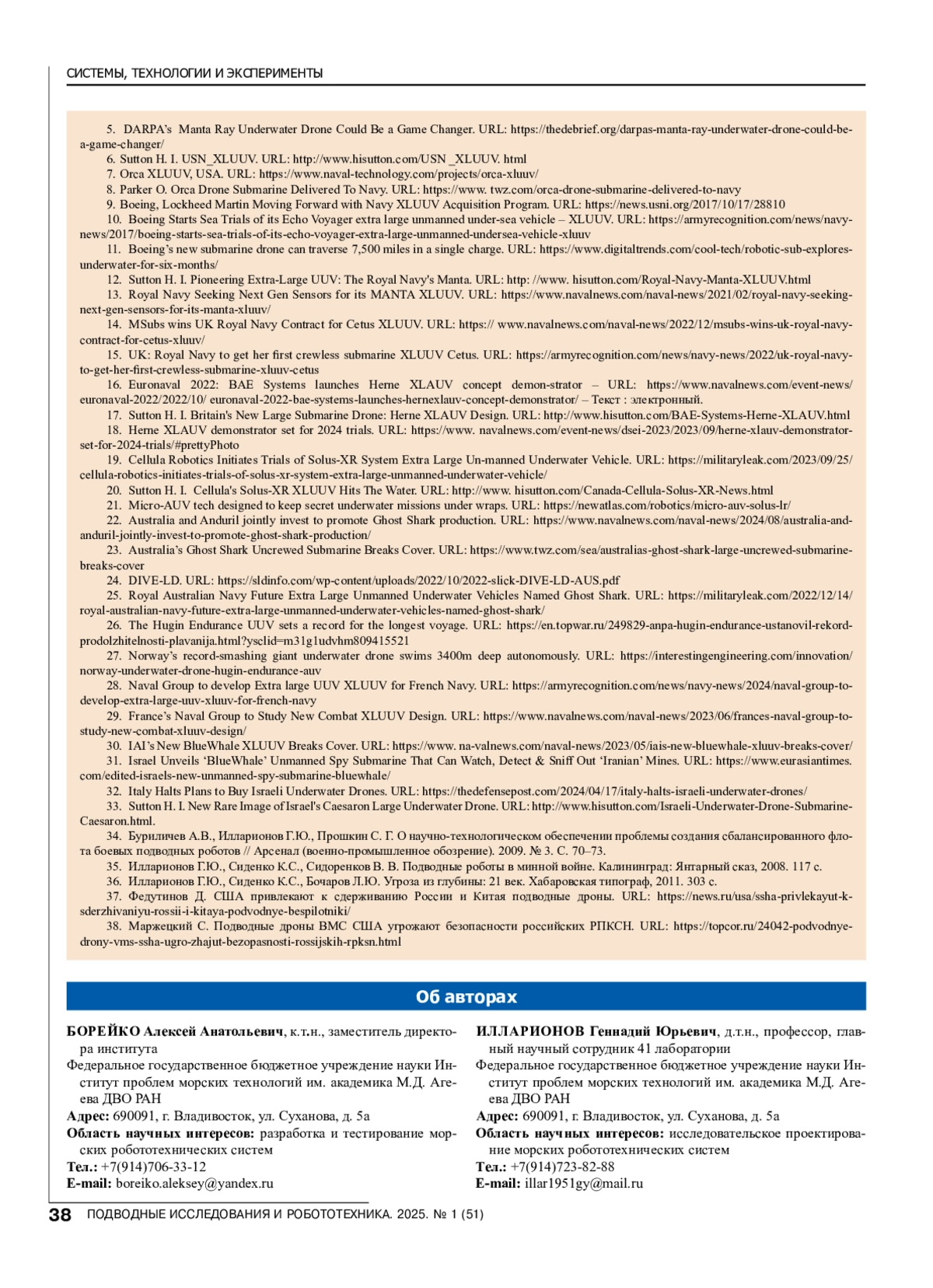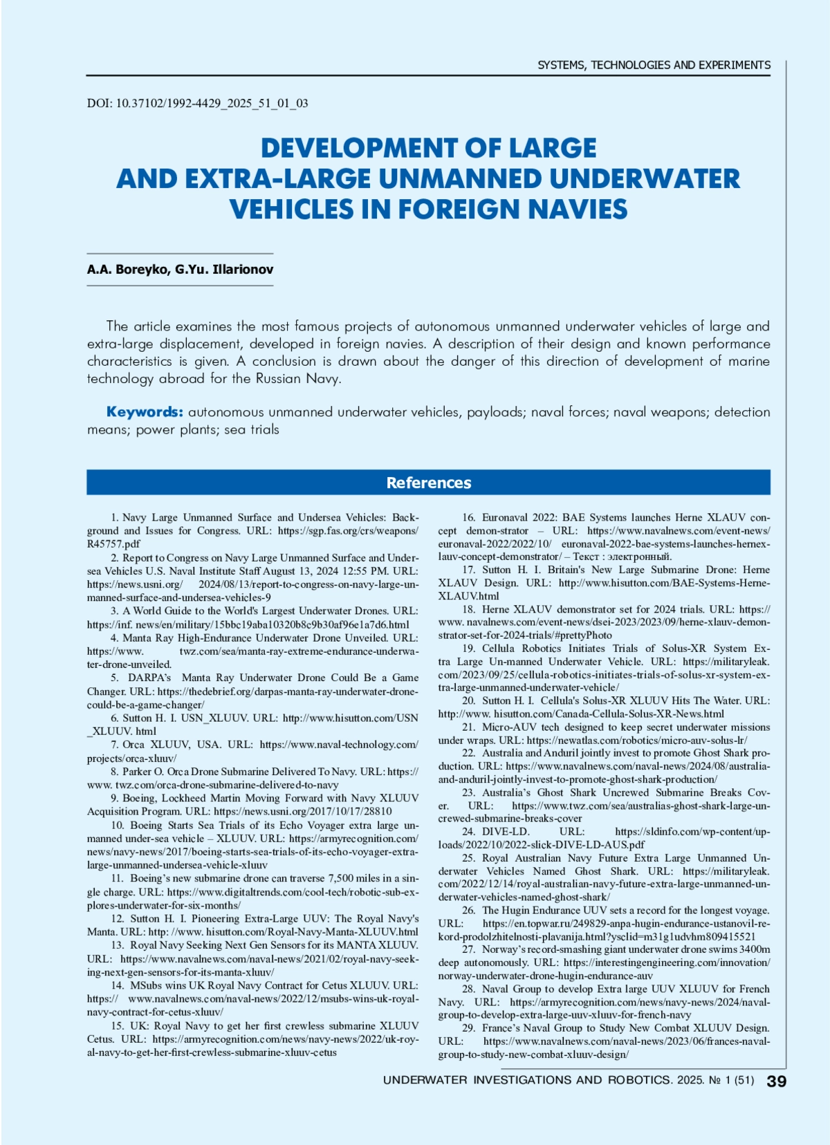 БОРЕЙКО А. А., ИЛЛАРИОНОВ Г. Ю. РАЗРАБОТКА АВТОНОМНЫХ НЕОБИТАЕМЫХ ПОДВОДНЫХ АППАРАТОВ БОЛЬШОГО И СВЕРХБОЛЬШОГО ВОДОИЗМЕЩЕНИЯ В ИНОСТРАННЫХ ВОЕННО-МОРСКИХ ФЛОТАХ // ПОДВОДНЫЕ ИССЛЕДОВАНИЯ И РОБОТОТЕХНИКА. 2025. № 1 (51)