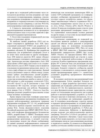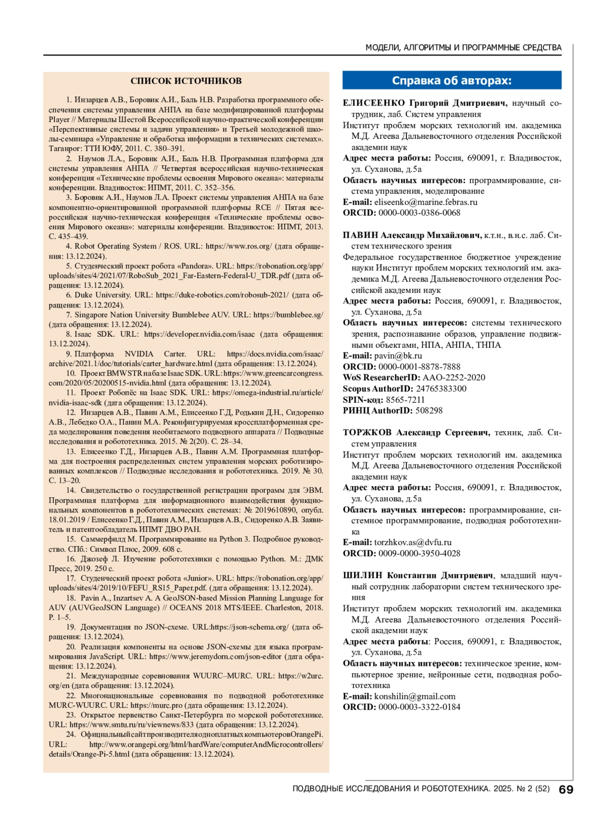 13. Елисеенко Г.Д., Инзарцев А.В., Павин А.М. Программная платформа для построения распределенных систем управления морских роботизированных комплексов // Подводные исследования и робототехника. 2019. № 30. C. 13-20.