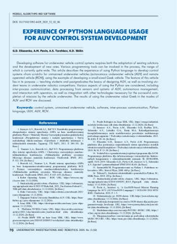 Создание программного обеспечения для систем управления подводными робототехническими комплексами сопряжено как с адаптацией апробированных технических решений, так и с разработкой новых. При этом в процесс могут вовлекаться различные средства разработки программ, спектр которых в настоящее время весьма широк. В статье рассматривается опыт использования языка Python при создании «с нуля» систем управления для необитаемых подводных аппаратов (как автономных, так и телеуправляемых) на примере разработки малогабаритного аппарата Geek. Особенность данного аппарата заключается в его назначении – обучение студентов и аспирантов основам проектирования подводной необитаемой техники, а также участие студенческих команд в соревнованиях по подводной робототехнике. Рассматриваются различные аспекты использования языка Python, включая межпроцессное взаимодействие, обработку данных с датчиков и систем подводного робота, автономное управление, взаимодействие с операторами на поверхности, а также интеграцию с другими технологиями, необходимыми для успешного выполнения аппаратом миссий под водой. Обсуждаются результаты применения подводного робота Geek для выполнения различных операций в телеуправляемом и автономном режимах.