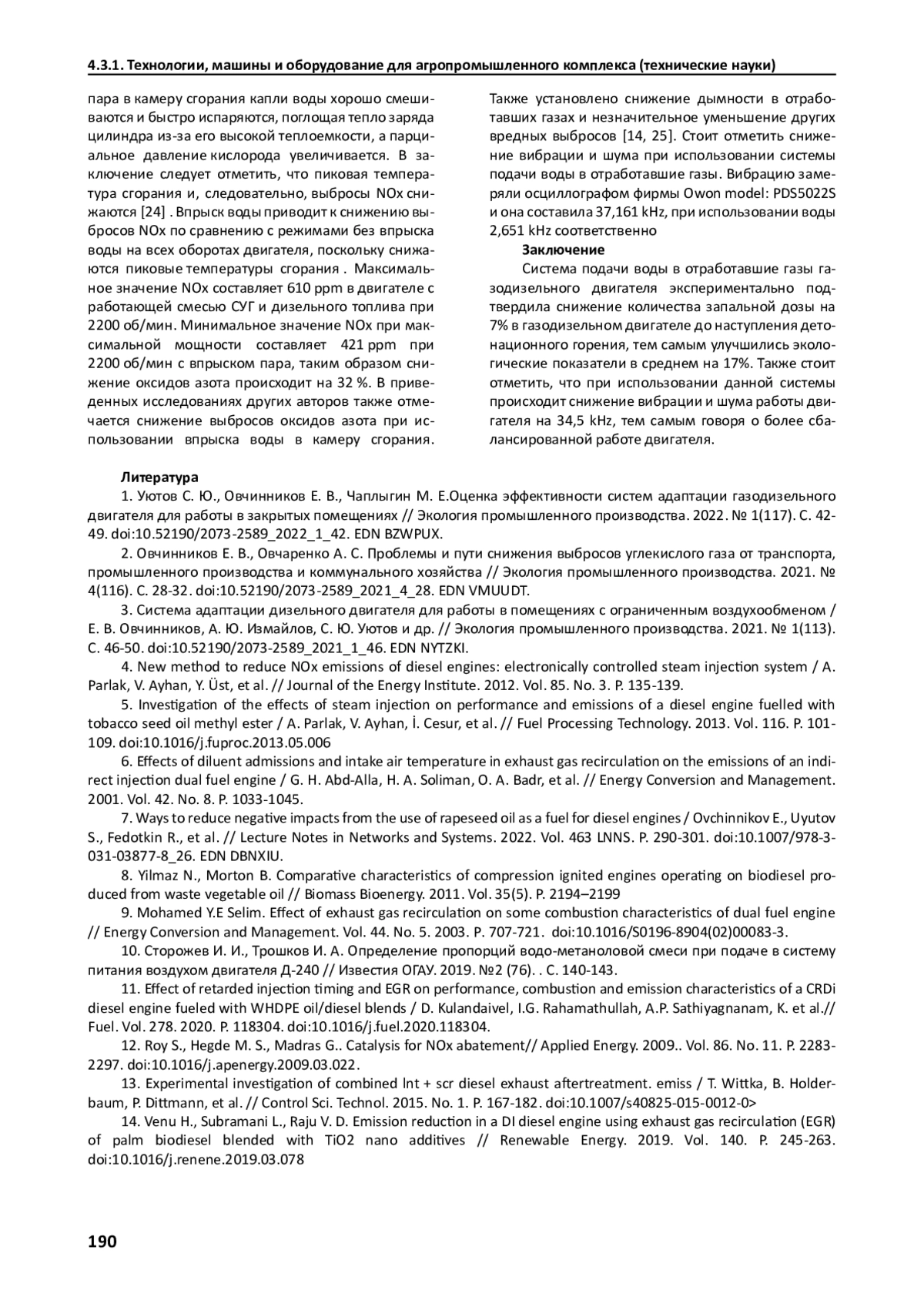 1. Уютов С. Ю., Овчинников Е. В., Чаплыгин М. Е.Оценка эффективности систем адаптации газодизельного двигателя для работы в закрытых помещениях // Экология промышленного производства. 2022. № 1(117). С. 4249. DOI: 10.52190/2073-2589_2022_1_42 EDN: BZWPUX