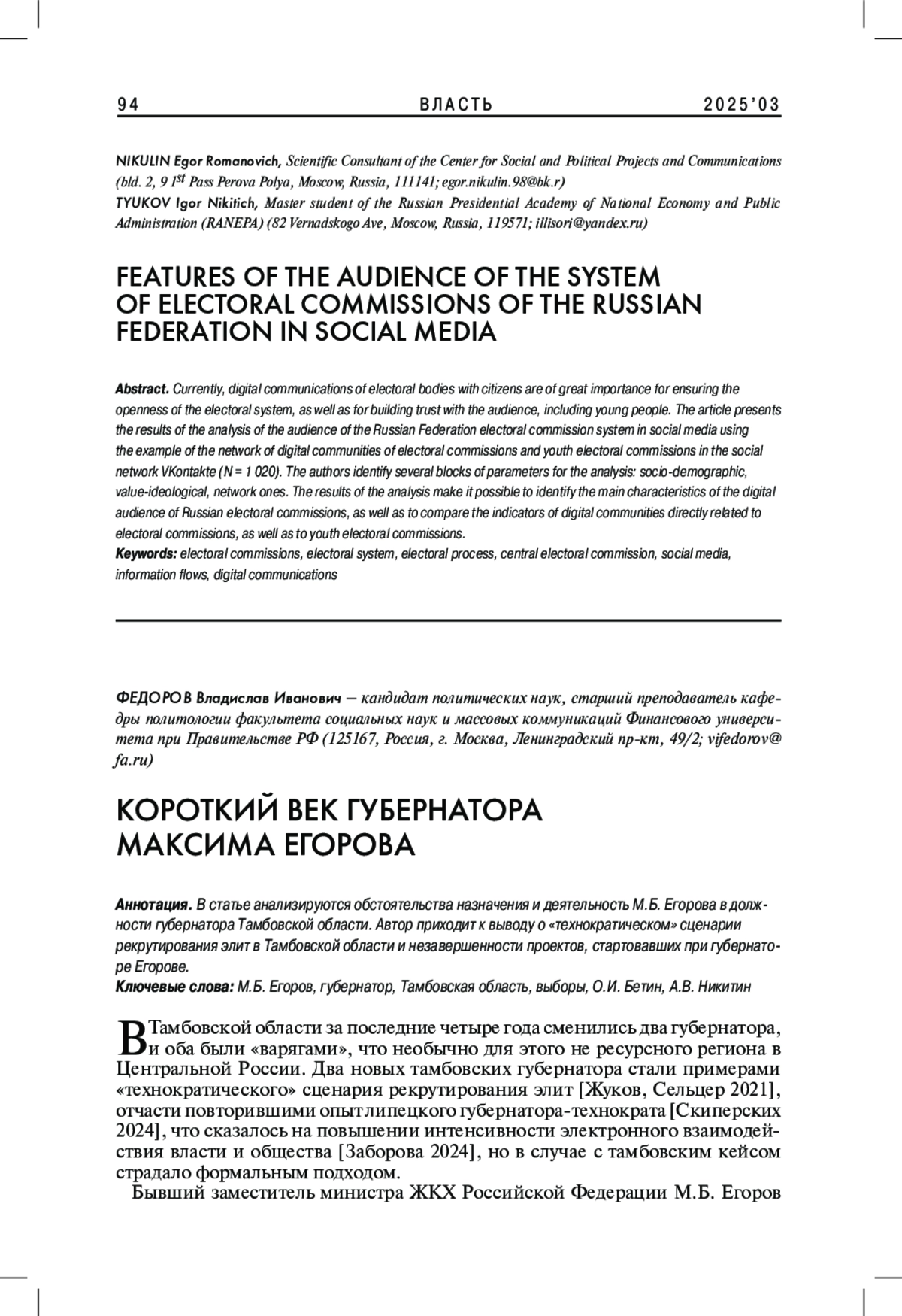 В статье анализируются обстоятельства назначения и деятельность М. Б. Егорова в должности губернатора Тамбовской области. Автор приходит к выводу о «технократическом» сценарии рекрутирования элит в Тамбовской области и незавершенности проектов, стартовавших при губернаторе Егорове.