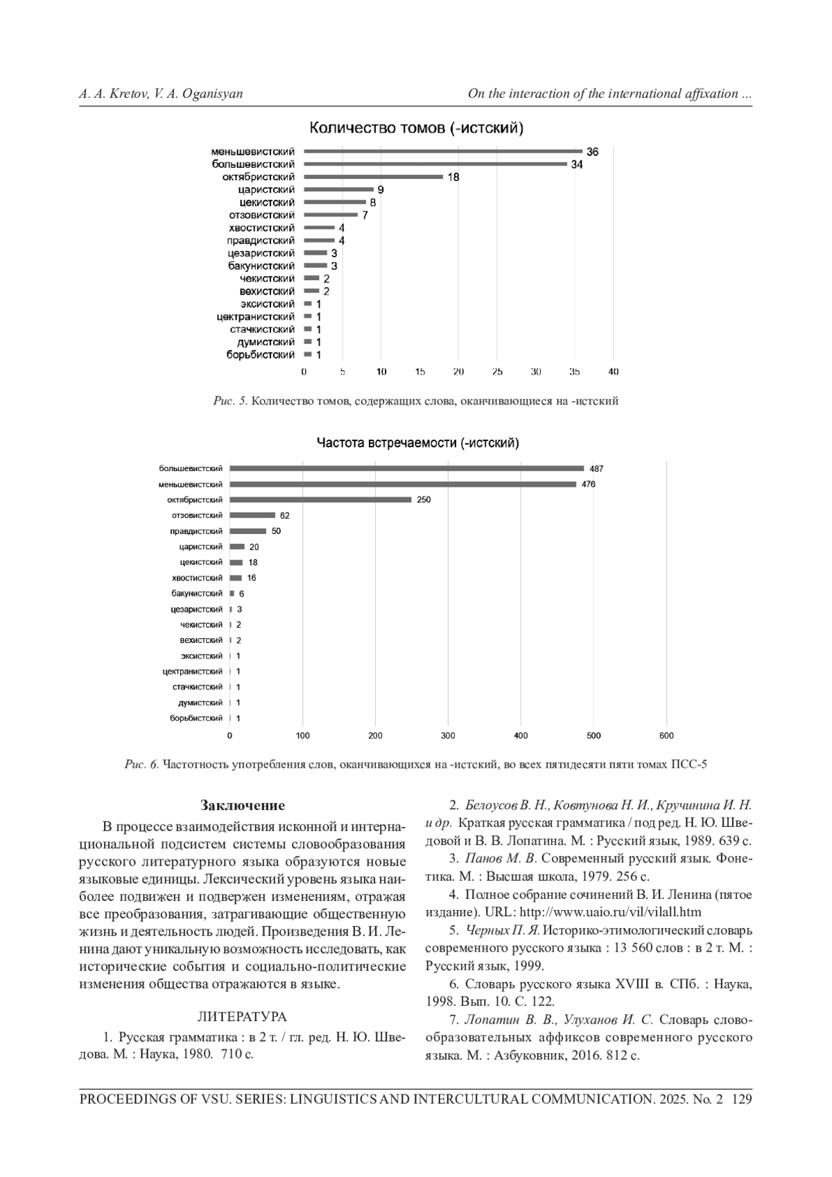 В русском языке встречаются не только заимствованные лексические единицы (иноязычные слова), но также и отвлекаемые от них интернациональные морфемы (аффиксы), участвующие в словообразовании. Есть два этапа, которые могут проходить заимствованные слова: фонографическое и морфологическое освоения. Первое происходит при звуковом или визуальном восприятии лексической единицы. При втором же этапе ей приписываются уже некие грамматические характеристики, свойственные языку, в который слово было заимствовано. Также поднимается проблема нечленимости заимствованных основ и как они становятся частью русской словообразовательной системы в статусе радикса. Система аффиксации русского языка состоит из нескольких взаимодействующих друг с другом подсистем, среди которых есть исконная и интернациональная подсистемы, элементы которых будут рассмотрены в этой статье. Авторы ставят перед собой цель описать совместную работу этих двух подсистем. Наибольший интерес вызывают дериваты от русских корней с использованием интернациональных суффиксов -ист, -изм, составляющие предмет исследования. Объектом исследования являются пятьдесят пять томов «Полного собрания сочинений» В. И. Ленина общим объемом в 4 504 182 словоупотребления. После проведения лемматизации (приведения слов к их начальной форме) всех анализируемых текстов, порожденных конкретной личностью, и получения частотного словаря языка В. И. Ленина из него были извлечены необходимые лексические единицы, которые содержали интернациональные суффиксы - ист и - изм (имеющие греко-латинское происхождение), а также русские корни. Таким образом, были получены результаты частотности употребления языковых единицы различных частей речи (имена существительные и прилагательные). Результаты были представлены в виде графической визуализации.