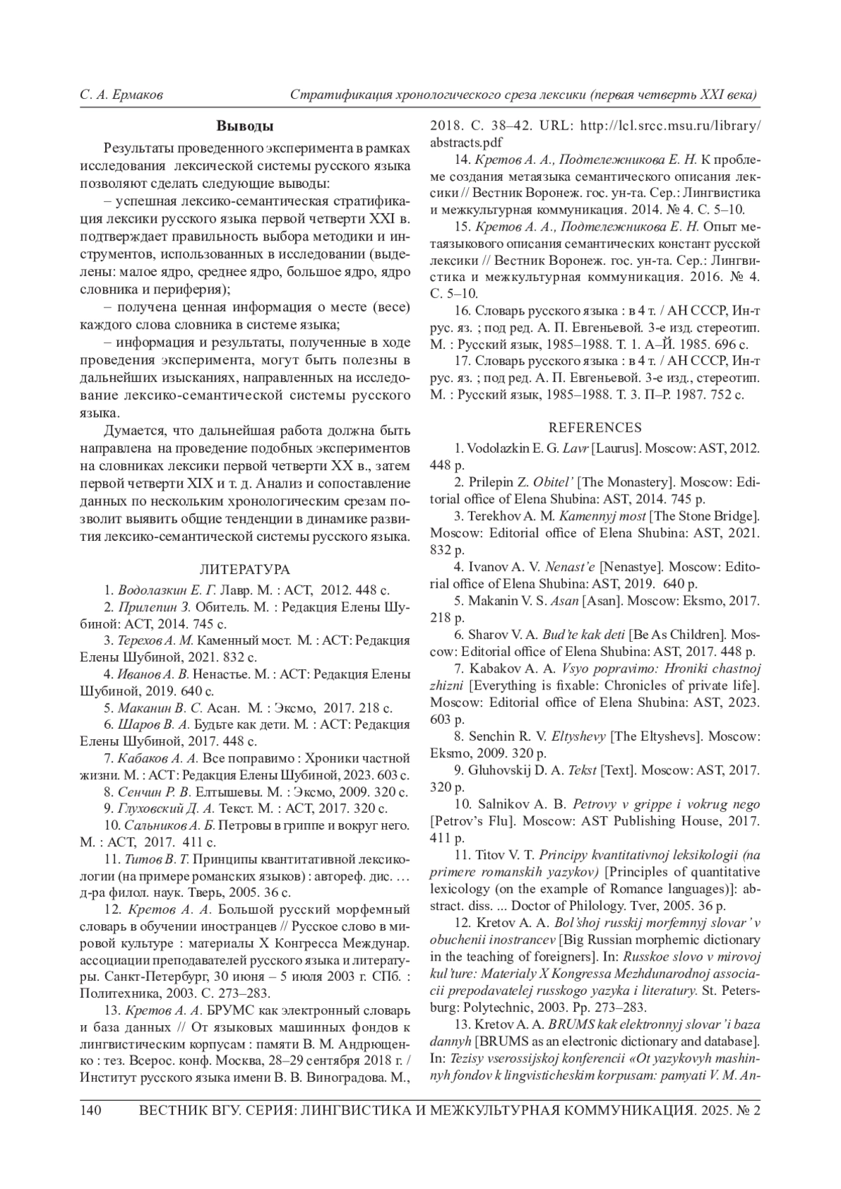 15. Кретов А. А., Подтележникова Е. Н. Опыт метаязыкового описания семантических констант русской лексики // Вестник Воронеж. гос. ун-та. Сер.: Лингвистика и межкультурная коммуникация. 2016. № 4. С. 5-10.