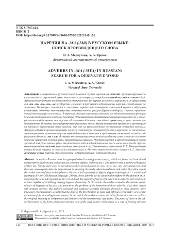 МЕРКУЛОВА И. А., КРЕТОВ А. А. НАРЕЧИЯ НА -МА (-МЯ) В РУССКОМ ЯЗЫКЕ: ПОИСК ПРОИЗВОДЯЩЕГО СЛОВА // ВЕСТНИК ВОРОНЕЖСКОГО ГОСУДАРСТВЕННОГО УНИВЕРСИТЕТА. СЕРИЯ: ЛИНГВИСТИКА И МЕЖКУЛЬТУРНАЯ КОММУНИКАЦИЯ. 2025. № 2