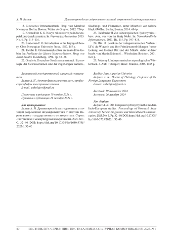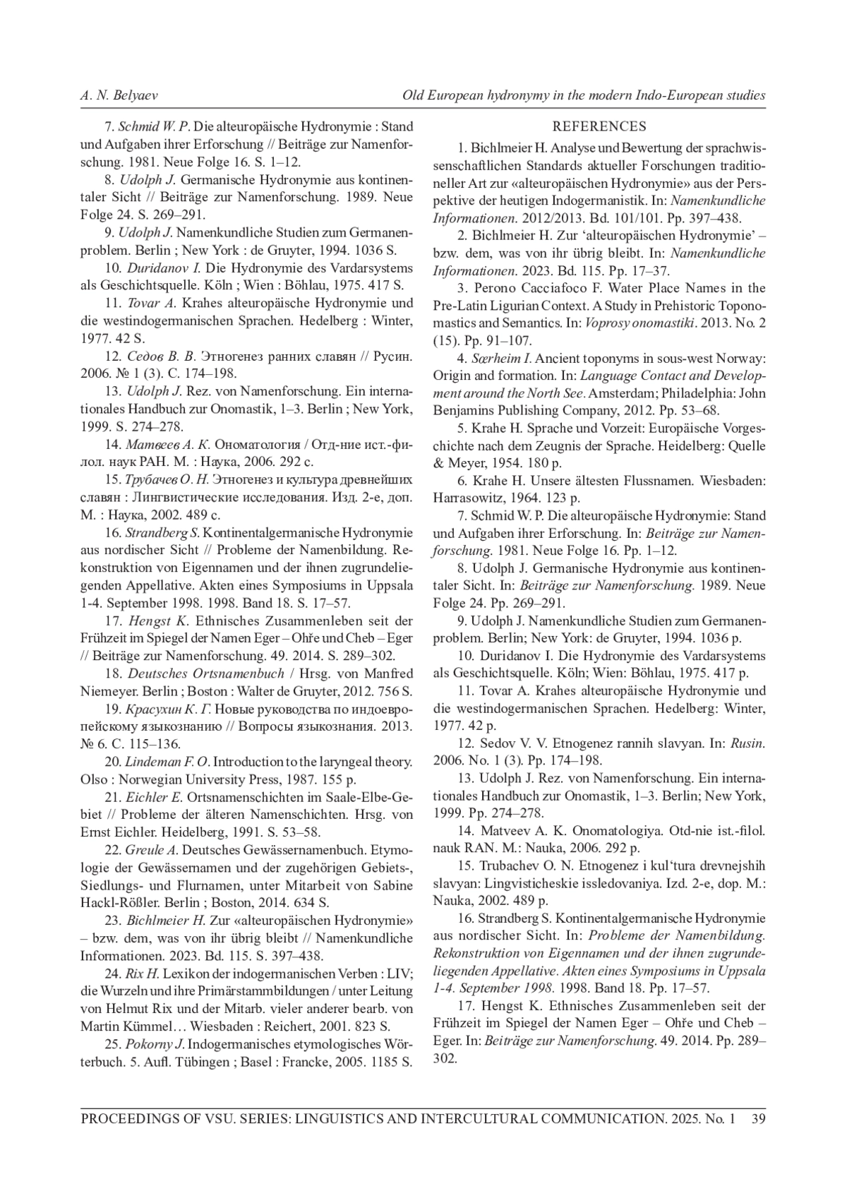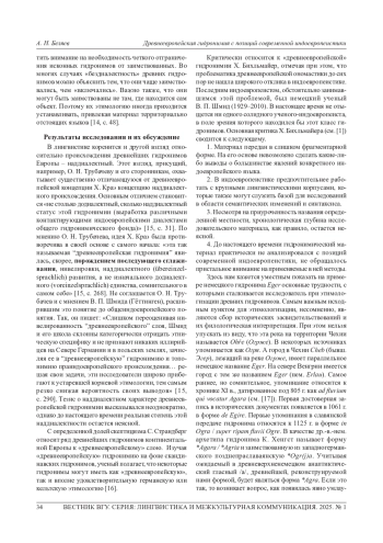 БЕЛЯЕВ А. Н. ДРЕВНЕЕВРОПЕЙСКАЯ ГИДРОНИМИЯ С ПОЗИЦИЙ СОВРЕМЕННОЙ ИНДОЕВРОПЕИСТИКИ // ВЕСТНИК ВОРОНЕЖСКОГО ГОСУДАРСТВЕННОГО УНИВЕРСИТЕТА. СЕРИЯ: ЛИНГВИСТИКА И МЕЖКУЛЬТУРНАЯ КОММУНИКАЦИЯ. 2025. № 1
