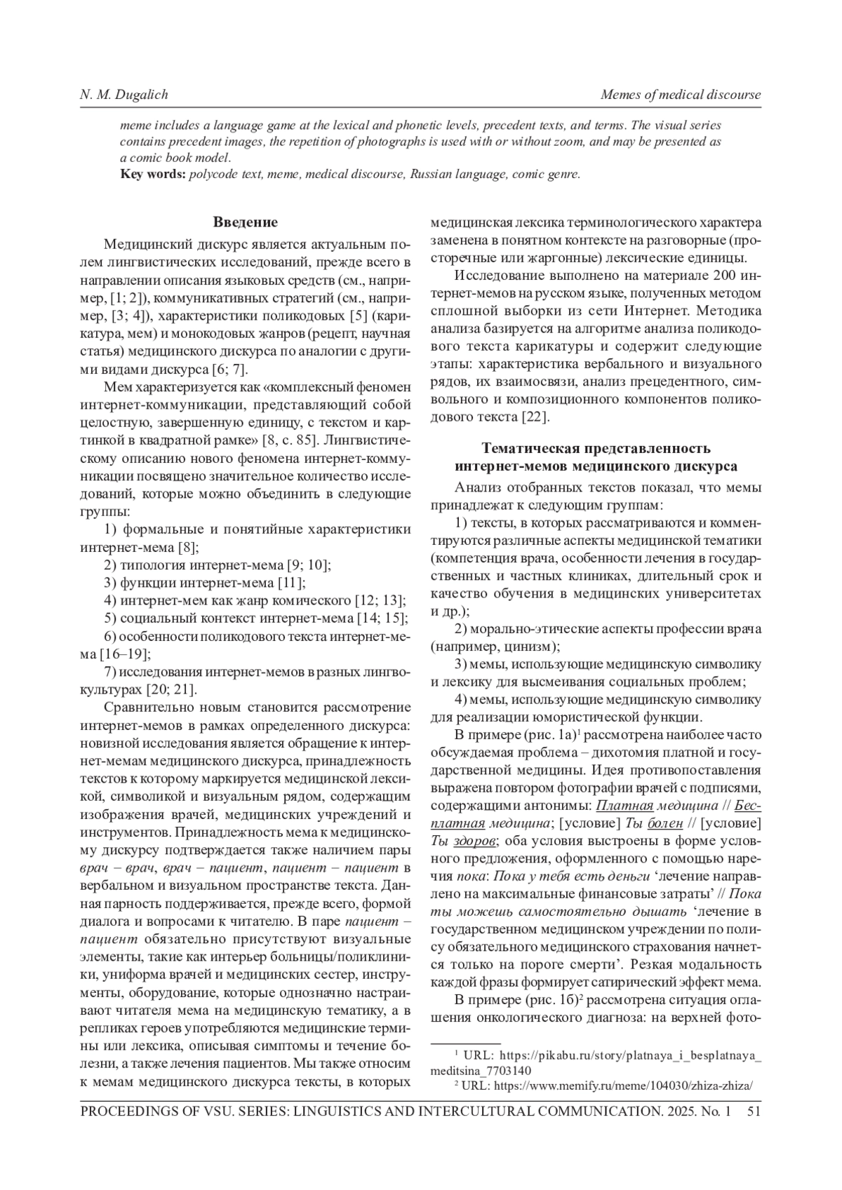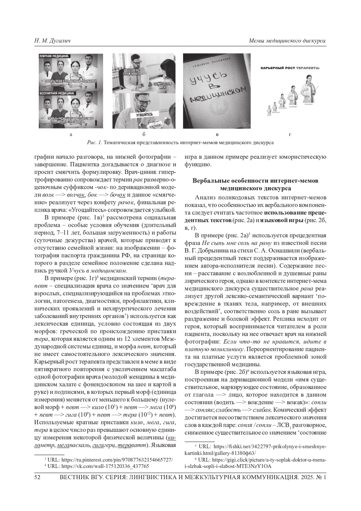 Поликодовые юмористические жанры привлекают внимание читателя и исследователей прежде всего своим вирусным характером, созависимостью вербальной и визуальной части, наличием прецедентного ряда, что требует пресуппозиционной базы у читателя для достижения комического эффекта. Проведенное исследование выполнено на материале 200 текстов интернет-мемов на русском языке, содержащих медицинскую лексику, визуальные образы врача и пациента, медицинских инструментов и помещений. Новизна предлагаемого исследования заключается в рассмотрении особенностей мемов как поликодового жанра медицинского дискурса, выделении характерных признаков вербального и визуального рядов, впервые отмечены бродячие сюжеты науровне текста и изображения. Институциональный медицинский дискурс остается актуальной темой исследования современной лингвистики, поскольку у исследователя присутствует вовлеченность в коммуникацию врач - пациент и отсутствует представление о завершенности лингвистического описания данной коммуникации ввиду постоянного обновления текстов, содержащих медицинскую тематику, лексику, а также визуального ряда, содержащего медицинскую символику. Исследование показало разнообразие тематики интернет-мемов данной группы: обсуждение компетенций врача, особенности платного и бесплатного лечения, обучение в медицинскихуниверситетах, морально-этические аспекты деятельности врача, а также немедицинские социальные проблемы, выраженные с помощью медицинской символики и лексики. Частотными также являются мемы, посвященные обсуждению социальной значимости профессии врача. Вербальный ряд поликодового текста медицинского интернет-мема включает языковую игру на лексическом и фонетическом уровнях, прецедентные тексты, термины. Изобразительный ряд содержит прецедентные образы, используется повторение фотографии с увеличением или без увеличения, построение визуального ряда по модели комикса.