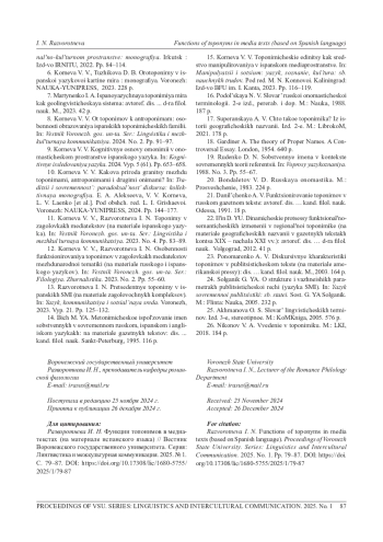 1. Корнева В. В. Топонимические исследования в новой научной парадигме // Вестник Воронеж, гос. унта. Сер.: Лингвистика и межкультурная коммуникация. 2016. № 1. С. 150-154.