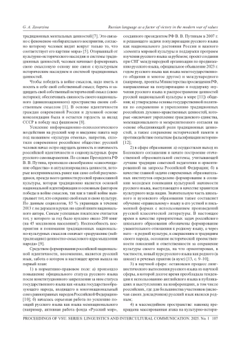 В настоящей статье исследуется понятие смысловой (ментальной) войны, описываются каналы для достижения результатов и целей, связанных с захватом виртуального и когнитивного пространства и его программированием, приводящим к смене культурно-исторических кодов и разрушению традиционных ментальных ценностей. Установлено, что влияние разрушительных манипулятивно-пропагандистских технологий, используемых современными украинскими политическими элитами, обусловило становление разрушительнъыхценностнъых идеалов, утверждающих равенство государственных и националистических символов. Усиление информационно-психологического воздействия на русский мир и введение пакетамер под названием «культура отмены» в настоящее время способствовали формированию в сознании русского человека понимания значимости идей русской православной культуры, которая традиционно является основой национальной идентификации и основным фактором победы в войне смыслов. Отмечено, что средством формирования российской национальной идентичности является русский язык, забота о котором в настоящее время вышла на первое место. Особое внимание уделяется описанию комплекса мероприятий, направленных на повышение статуса русского языка в нормативноправовом и массмедийном поле российского общества, а также на поддержку русского языка и распространение ценностей русской национальной культуры в мире. Сделан вывод о важности сохранения русского языка как фактора победы в современной ментальной войне: оторванный от культурноисторического наследия и системы традиционных ценностей, человек начинает формировать свою смысловую основу вне связи с собственной национальной идентичностью.