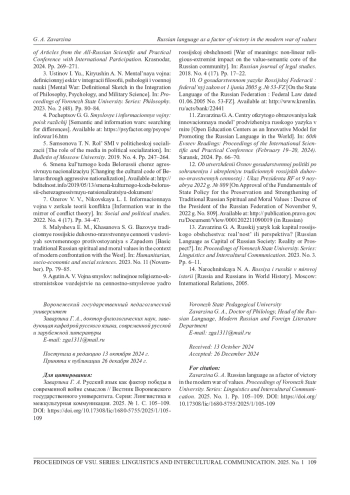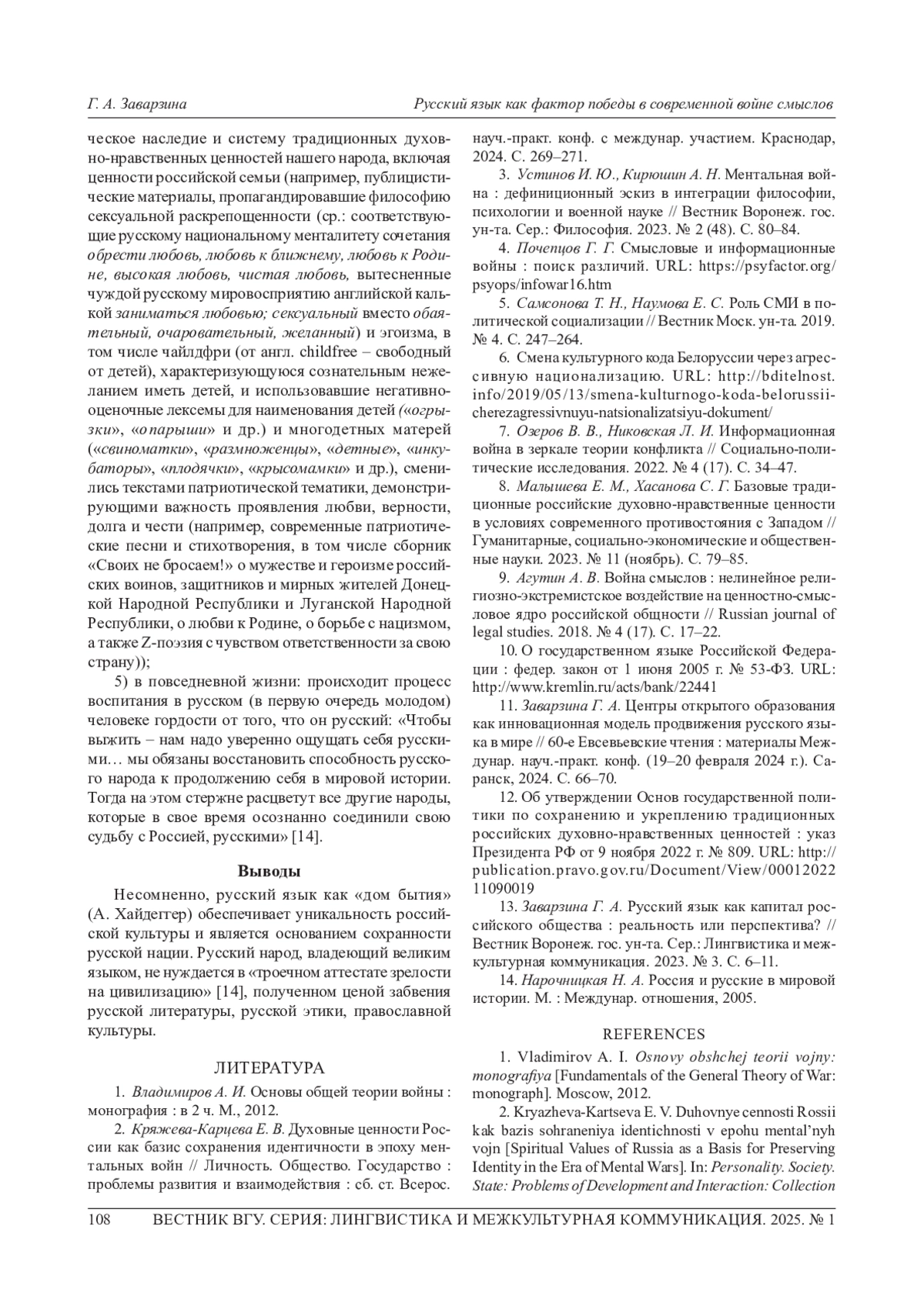 13. Заварзина Г. А. Русский язык как капитал российского общества: реальность или перспектива? // Вестник Воронеж, гос. ун-та. Сер.: Лингвистика и межкультурная коммуникация. 2023. № 3. С. 6-11.