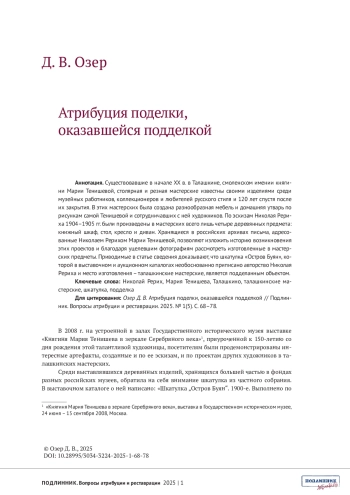 Существовавшие в начале ХХ в. в Талашкине, смоленском имении княгини Марии Тенишевой, столярная и резная мастерские известны своими изделиями среди музейных работников, коллекционеров и любителей русского стиля и 120 лет спустя после их закрытия. В этих мастерских была создана разнообразная мебель и домашняя утварь по рисункам самой Тенишевой и сотрудничавших с ней художников. По эскизам Николая Рериха 1904-1905 гг. были произведены в мастерских всего лишь четыре деревянных предмета: книжный шкаф, стол, кресло и диван. Хранящиеся в российских архивах письма, адресованные Николаем Рерихом Марии Тенишевой, позволяют изложить историю возникновения этих проектов и благодаря уцелевшим фотографиям рассмотреть изготовленные в мастерских предметы. Приводимые в статье сведения доказывают, что шкатулка «Остров Буян», которой в выставочном и аукционном каталогах необоснованно приписано авторство Николая Рериха и место изготовления - талашкинские мастерские, является подделанным объектом.