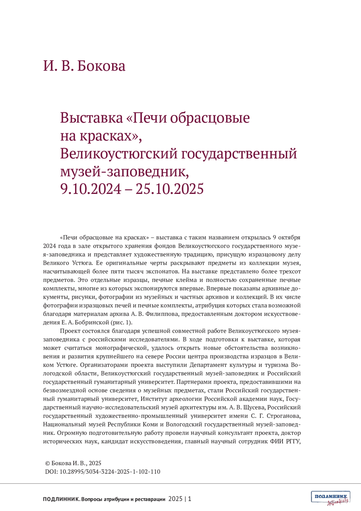 «Печи обрасцовые на красках» – выставка с таким названием открылась 9 октября 2024 года в зале открытого хранения фондов Великоустюгского государственного музея-заповедника и представляет художественную традицию, присущую изразцовому делу Великого Устюга. Ее оригинальные черты раскрывают предметы из коллекции музея, насчитывающей более пяти тысяч экспонатов. На выставке представлено более трехсот предметов. Это отдельные изразцы, печные клейма и полностью сохраненные печные комплекты, многие из которых экспонируются впервые. Впервые показаны архивные документы, рисунки, фотографии из музейных и частных архивов и коллекций. В их числе фотографии изразцовых печей и печные комплекты, атрибуция которых стала возможной благодаря материалам архива А. В. Филиппова, предоставленным доктором искусствоведения Е. А. Бобринской (рис. 1).