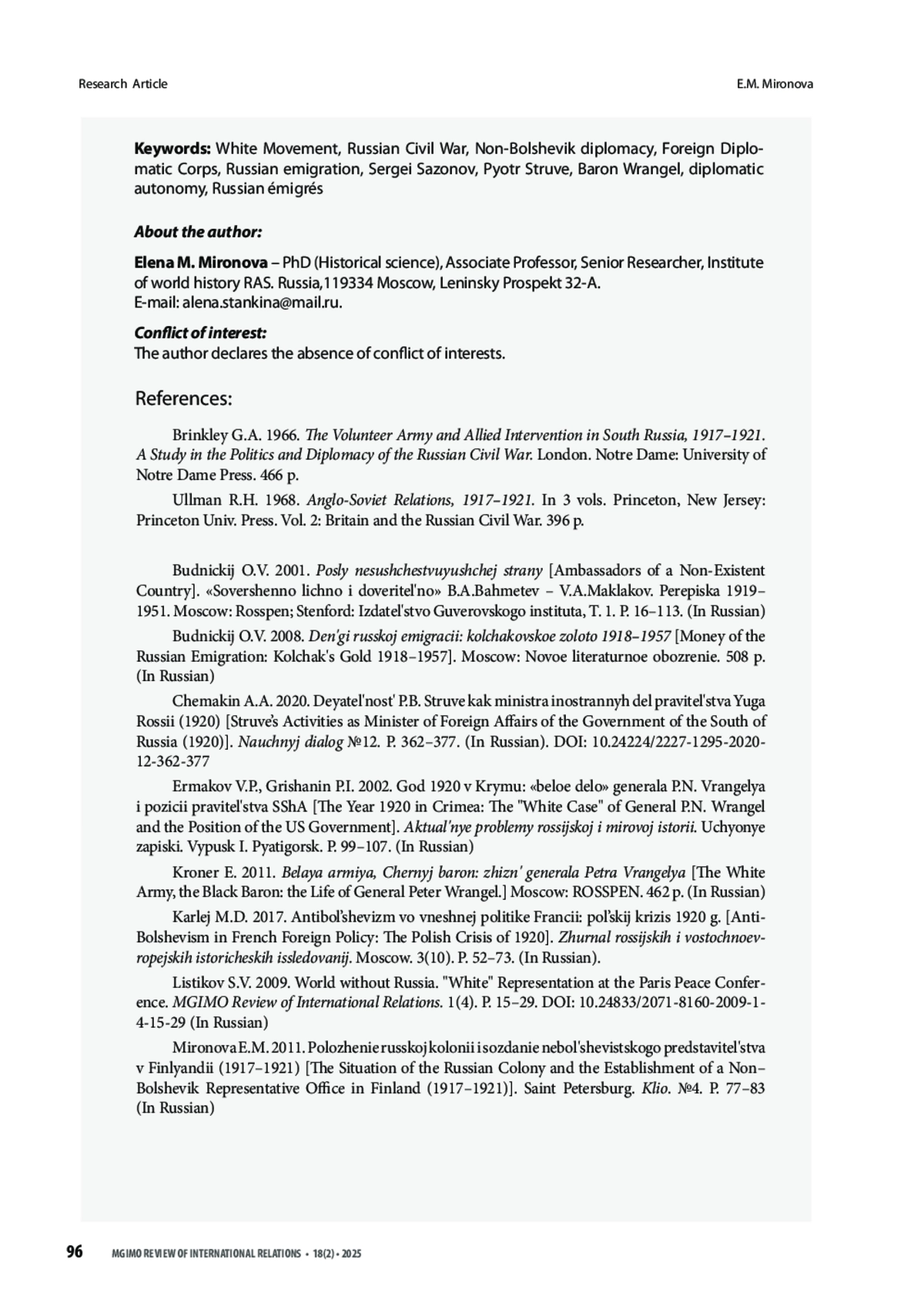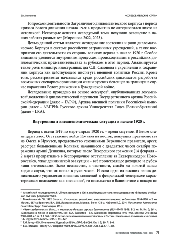В статье на основе обширного источникового материала представлен сложный период деятельности Заграничного дипломатического корпуса Белого движения. В условиях поражений, которые терпели белые в России, их внешнеполитическое представительство продолжало работать. Более того, руководство Корпуса приняло решение о том, что для его учреждений не только подчинение органам Советской власти невозможно, но недопустима и передача дел дипломатическим представительствам Москвы. Был взят курс на продолжение самостоятельного и независимого существования Корпуса в случае поражения белых в Гражданской войне. Предпринимались усилия по восстановлению в дипломатической структуре иерархии и дисциплины. Был сокращён личный состав, но сохранена репрезентативность учреждений Корпуса в мире. Велась работа по обеспечению финансирования его дальнейшей деятельности. Ведомство продолжало повседневную работу, в которой выделились и усиливались новые направления. Оно активно оказывало помощь растущему количеству русских беженцев, искало пути сохранения русского имущества за рубежом. Руководство структуры начало разрабатывать вопрос о правовой защите покинувших родину соотечественников на случай поражения Белого движения. Приход к власти в Крыму генерала барона Врангеля был неоднозначно встречен русским обществом за рубежом. Возглавлявший дипломатическое ведомство с января 1919 г. С. Д. Сазонов проявил полную лояльность по отношению к созданному в Севастополе правительству. Тем не менее Врангель отправил его в отставку, передав управление внешней политикой П. Б. Струве. Однако С. Д. Сазонов успел подготовить позиции для старейшины Корпуса – посла в Риме М. Н. Гирса, который и возглавил Корпус после отставки Сазонова. П. Б. Струве разделил с ним руководство и ответственность. Корпус укрепил свои независимые позиции и вошёл в последний этап противостояния с большевиками как партнёр, а не подчинённая центру структура, что дало ему перспективу продолжения работы после окончания Гражданской войны на Родине.