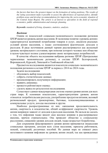 В данной статье представлена методика рейтинговой оценки социальноэкономического положения регионов Центрально-Черноземного экономического района (ЦЧЭР). Предложенная методика основана на комплексном анализе ключевых показателей, характеризующих экономическую активность, социальную сферу и экологическую устойчивость каждого региона. Целью исследования является выявление лидеров и аутсайдеров в социально-экономическом развитии внутри ЦЧЭР, а также определение факторов, оказывающих наибольшее влияние на формирование рейтинговых позиций. Результаты рейтинговой оценки позволяют оценить эффективность региональной политики, выявить проблемные зоны и разработать рекомендации по улучшению социально-экономического положения регионов ЦЧЭР. Статья представляет интерес для специалистов в области региональной экономики, государственного управления и стратегического планирования.