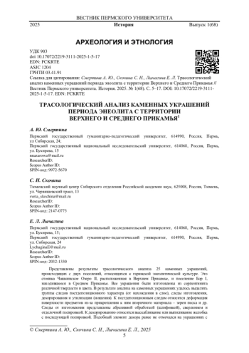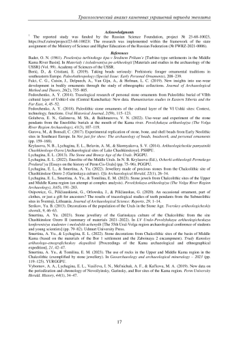 14. Смертина А.Ю., Лычагина Е.Л. Каменные украшения с энеолитических памятников бассейна Средней Камы (по материалам поселения Бор I и стоянки Забойная II) // Тр. Кам. археол.-этнограф. экспедиции. 2022. № 21. С. 42-47. DOI: 10.24412/2658-7637-2022-21-42-47 EDN: AFPCSA