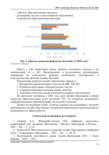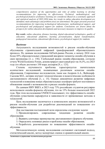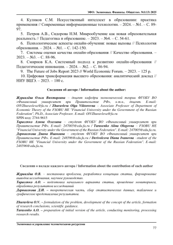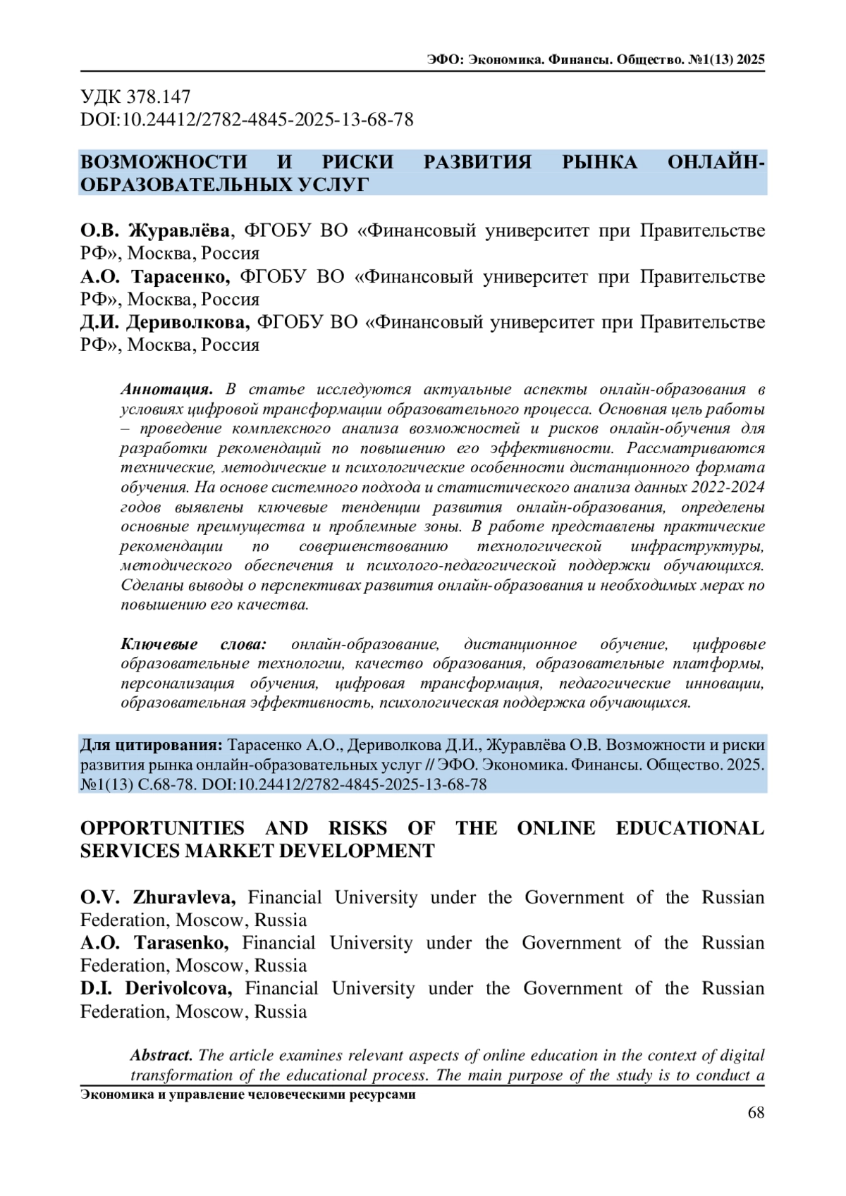 ЖУРАВЛЁВА О. В., ТАРАСЕНКО А. О., ДЕРИВОЛКОВА Д. И. ВОЗМОЖНОСТИ И РИСКИ РАЗВИТИЯ РЫНКА ОНЛАЙН-ОБРАЗОВАТЕЛЬНЫХ УСЛУГ // ЭФО: ЭКОНОМИКА. ФИНАНСЫ. ОБЩЕСТВО. 2025. № 1 (13)