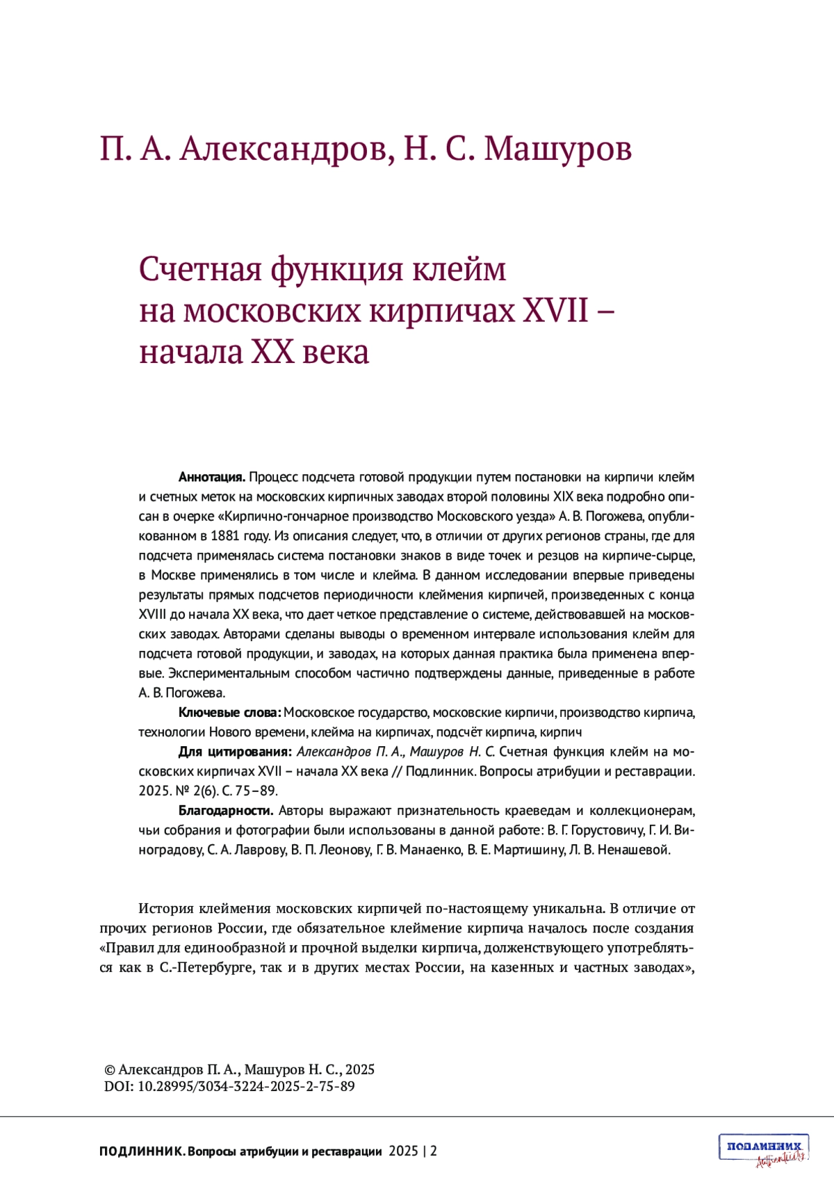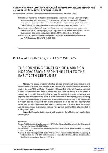 Процесс подсчета готовой продукции путем постановки на кирпичи клейм и счетных меток на московских кирпичных заводах второй половины XIX века подробно описан в очерке «Кирпично-гончарное производство Московского уезда» А. В. Погожева, опубликованном в 1881 году. Из описания следует, что, в отличии от других регионов страны, где для подсчета применялась система постановки знаков в виде точек и резцов на кирпиче-сырце, в Москве применялись в том числе и клейма. В данном исследовании впервые приведены результаты прямых подсчетов периодичности клеймения кирпичей, произведенных с конца XVIII до начала XX века, что дает четкое представление о системе, действовавшей на московских заводах. Авторами сделаны выводы о временном интервале использования клейм для подсчета готовой продукции, и заводах, на которых данная практика была применена впервые. Экспериментальным способом частично подтверждены данные, приведенные в работе А. В. Погожева.