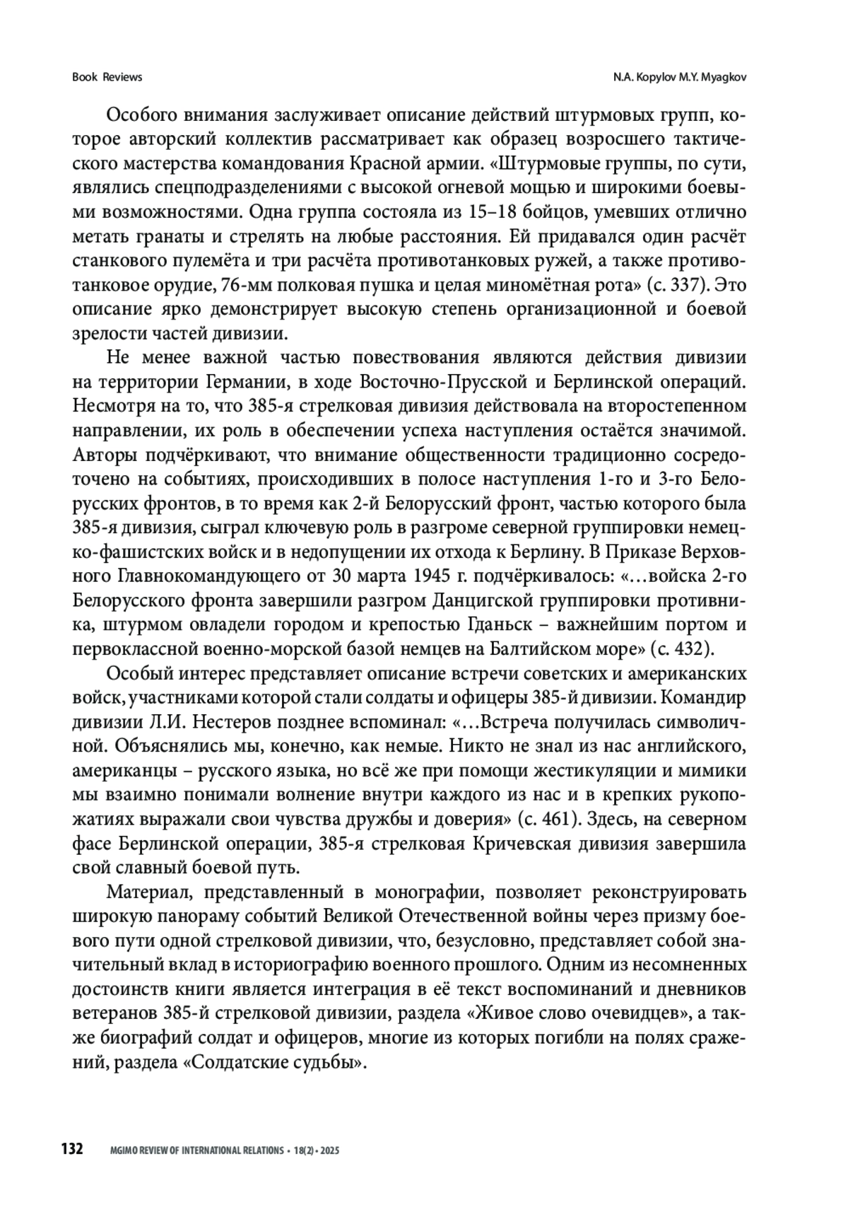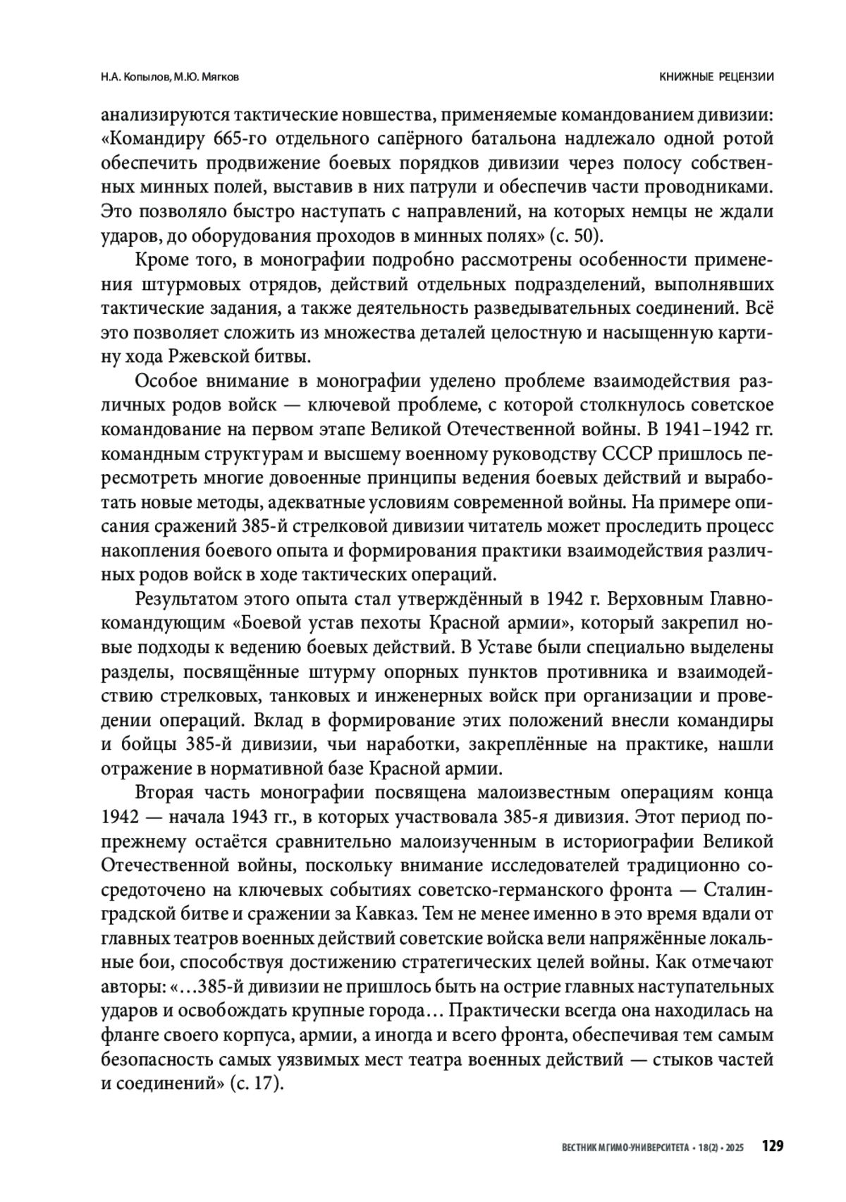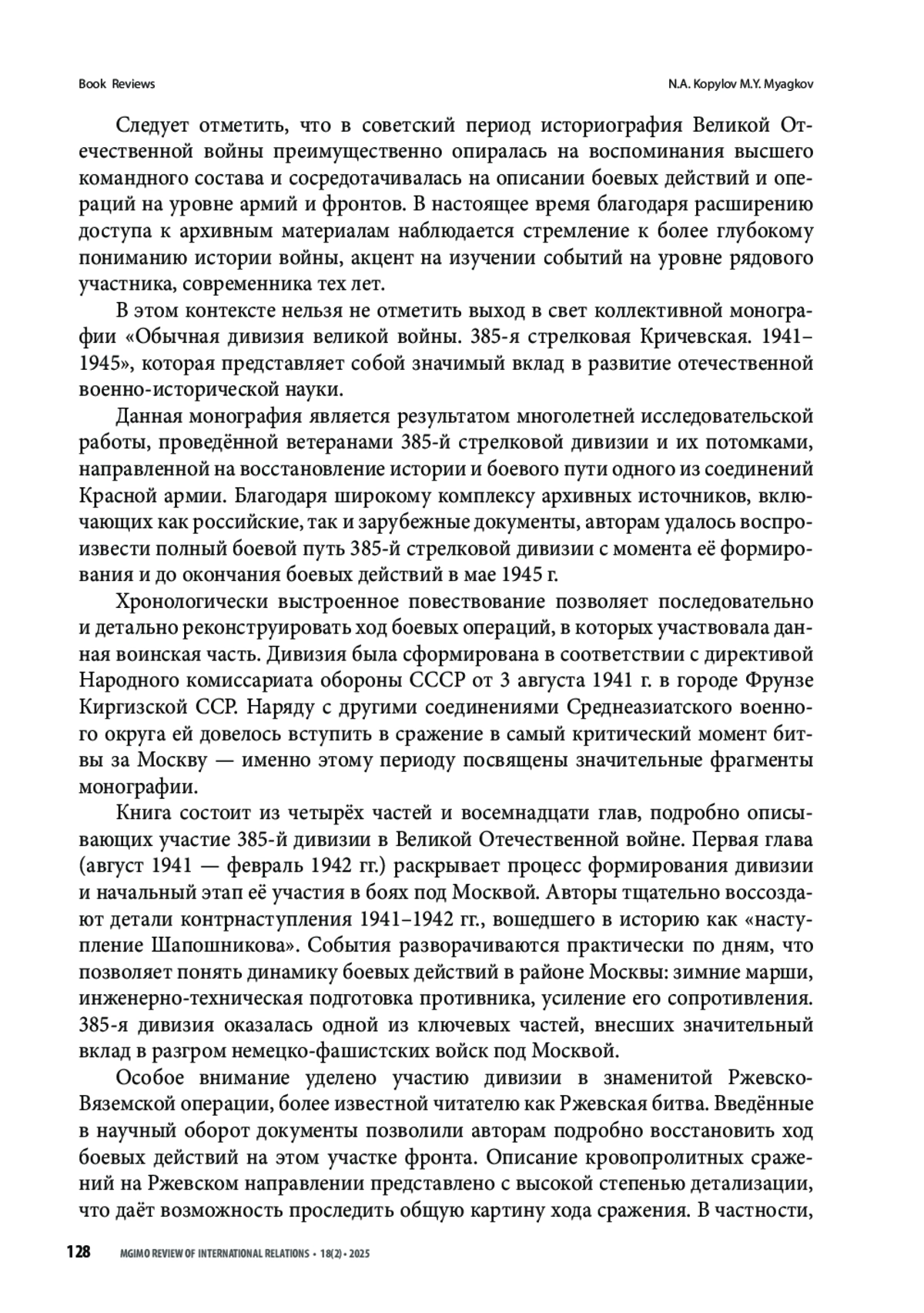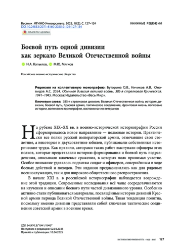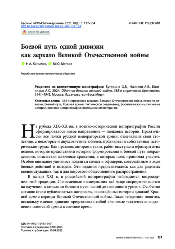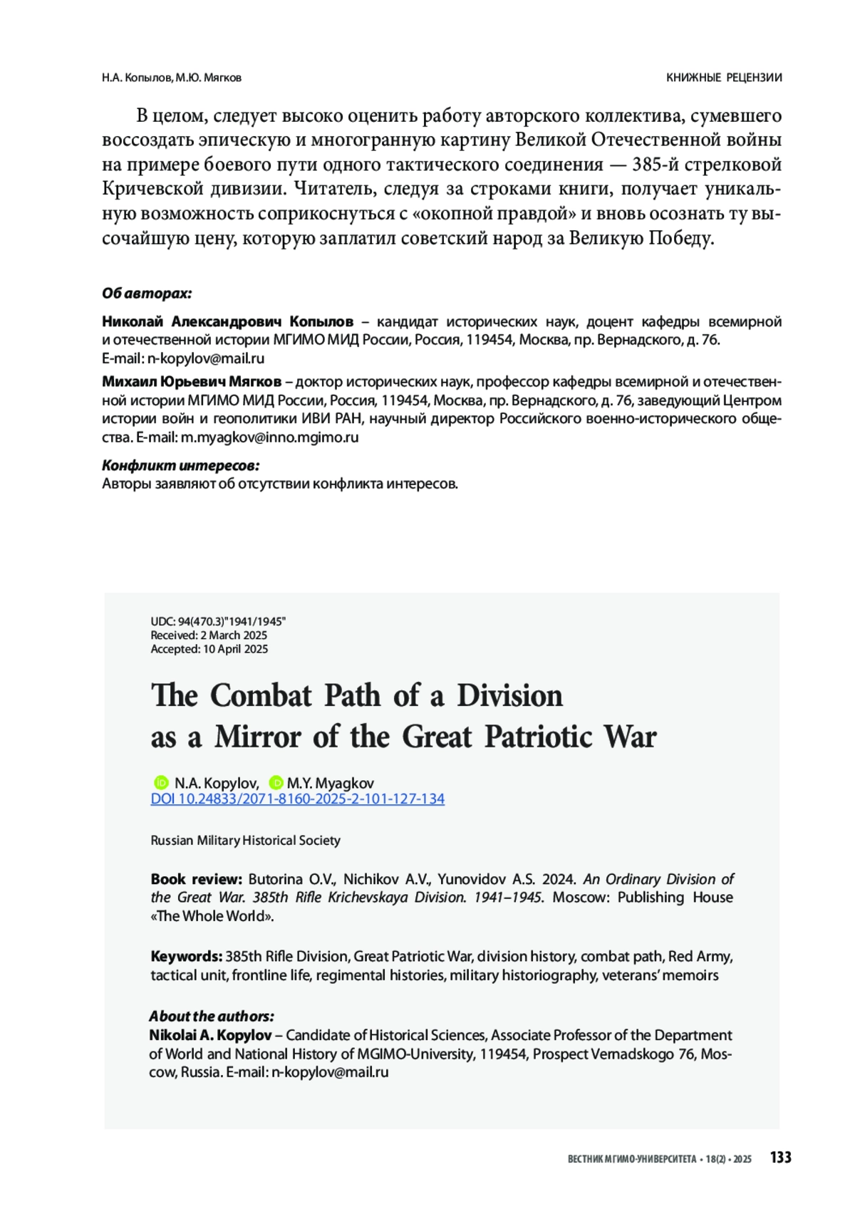 КОПЫЛОВ Н. А., МЯГКОВ М. Ю. БОЕВОЙ ПУТЬ ОДНОЙ ДИВИЗИИ КАК ЗЕРКАЛО ВЕЛИКОЙ ОТЕЧЕСТВЕННОЙ ВОЙНЫ // ВЕСТНИК МГИМО-УНИВЕРСИТЕТА. 2025. ТОМ 18, № 2