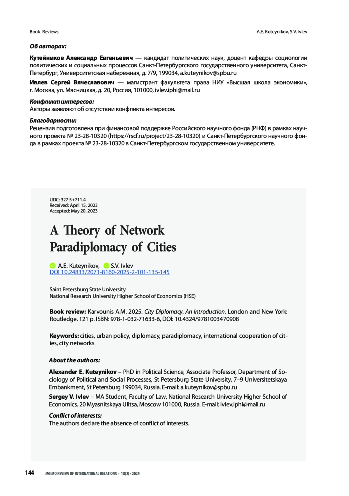 Рецензия на книгу: Karvounis A. M. City Diplomacy. An Introduction. London and New York: Routledge, 2025, 121 p. ISBN: 978-1-032-71633-6, DOI: 10.4324/9781003470908