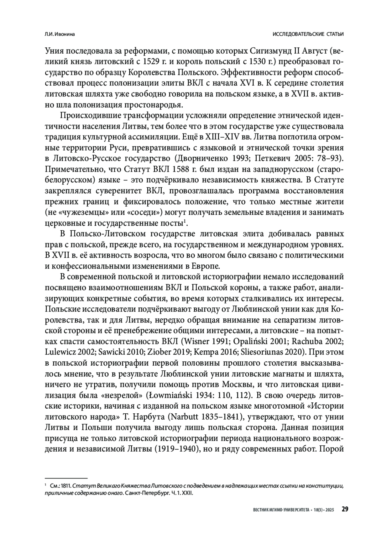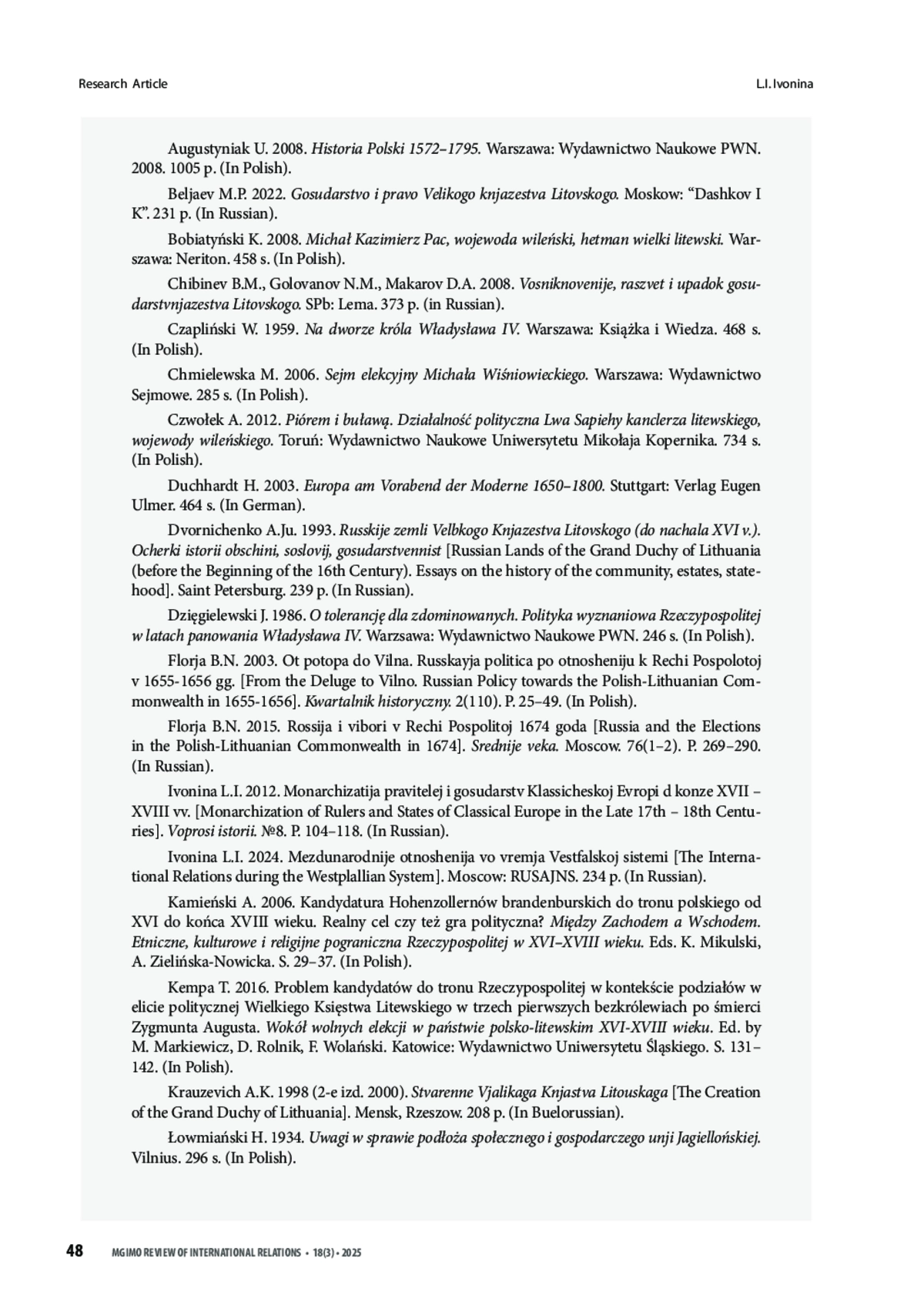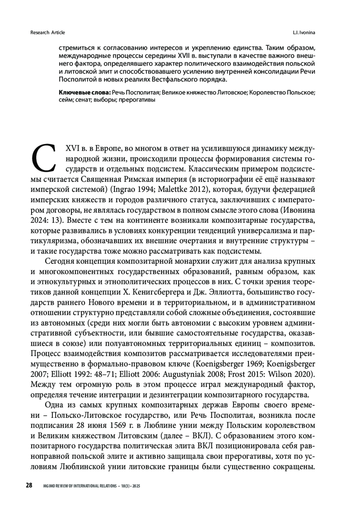 В статье исследуется взаимодействие политических элит Великого княжества Литовского (ВКЛ) и Королевства Польского в контексте формирования Вестфальской системы международных отношений в XVII веке. На основе системного подхода, концепции композитарного государства и теории конфессионализации анализируется влияние международной среды на политическую динамику между литовской и польской элитами. С момента подписания Люблинской унии 1569 г. элиты ВКЛ стремились закрепить равноправие с польской стороной и последовательно защищали свои интересы во всех политических вопросах, включая внешнюю политику. Особенно интенсивным это взаимодействие стало в XVII веке, что во многом было связано с масштабными политическими и конфессиональными изменениями в Европе, достигшими кульминации в период Тридцатилетней войны (1618–1648 гг.) и получившими юридическое оформление в Вестфальском мире 1648 года. Исследование показывает, что, несмотря на периодически возникавшие разногласия между элитами Польши и ВКЛ, они не рассматривали друг друга как противников. Напротив, их объединяло конституционное устройство, формировавшаяся вследствие полонизации общая культурная идентичность и необходимость поддержания авторитета Речи Посполитой в новой Вестфальской системе европейских государств. Автор приходит к выводу, что формирование Вестфальской системы международных отношений оказало заметное влияние на взаимодействие элит Великого княжества Литовского и Королевства Польского. Международная среда этого периода способствовала скорее интеграции, нежели дезинтеграции обоих составных частей Речи Посполитой. Несмотря на частые изменения конфессионально-политических союзов и внутренние разногласия, общие внешнеполитические вызовы, связанные с окружением Польско-Литовского государства сильными конкурентами, такими как Московское государство и Швеция, вынуждали элиты обеих частей стремиться к согласованию интересов и укреплению единства. Таким образом, международные процессы середины XVII века выступали в качестве важного внешнего фактора, определявшего характер политического взаимодействия польской и литовской элит и способствовавшего усилению внутренней консолидации Речи Посполитой в новых реалиях Вестфальского порядка.
